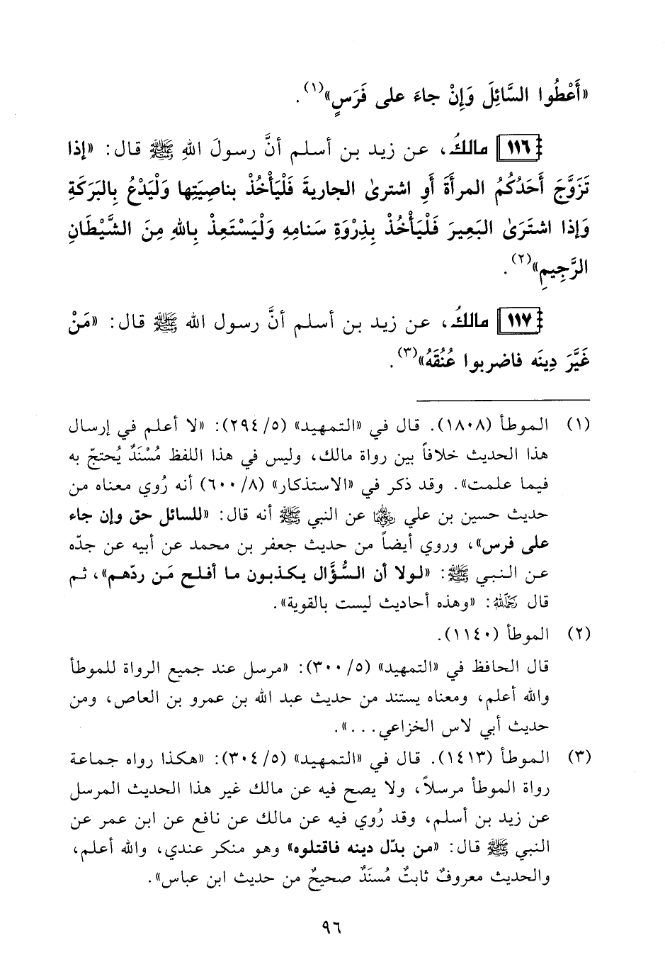 117 - مالكُ، عن زيد بن أسلم أنَّ رسول الله - صلى الله عليه وسلم - قال: "مَنْ غَيَّرَ دِينَه فاضربوا عُنُقَهُ" (¬3).