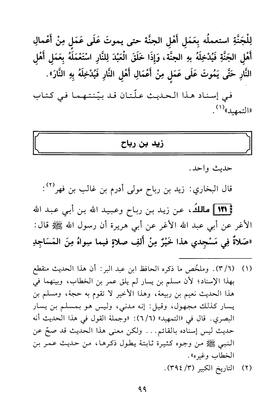 (¬1) (6/ 3). وملخّص ما ذكره الحافظ ابن عبد البر: أن هذا الحديث منقطع بهذا الإسناد؛ لأن مسلم بن يسار لم يلق عمر بن الخطاب، وبينهما في هذا الحديث نعيم بن ربيعة، وهذا الأخير لا تقوم به حجة، ومسلمٌ بن يسار كذلك مجهول، وقيل: إنه مدني، وليس هو بمسلم بن يسار البصري. قال في "التمهيد" (6/ 6): "وجملة القول في هذا الحديث أنه حديث ليس إسناده بالقائم. . . ولكن معنى هذا الحديث قد صحّ عن النبي - صلى الله عليه وسلم - من وجوه كثيرة ثابتة يطول ذكرها، من حديث عمر بن الخطاب وغيره".