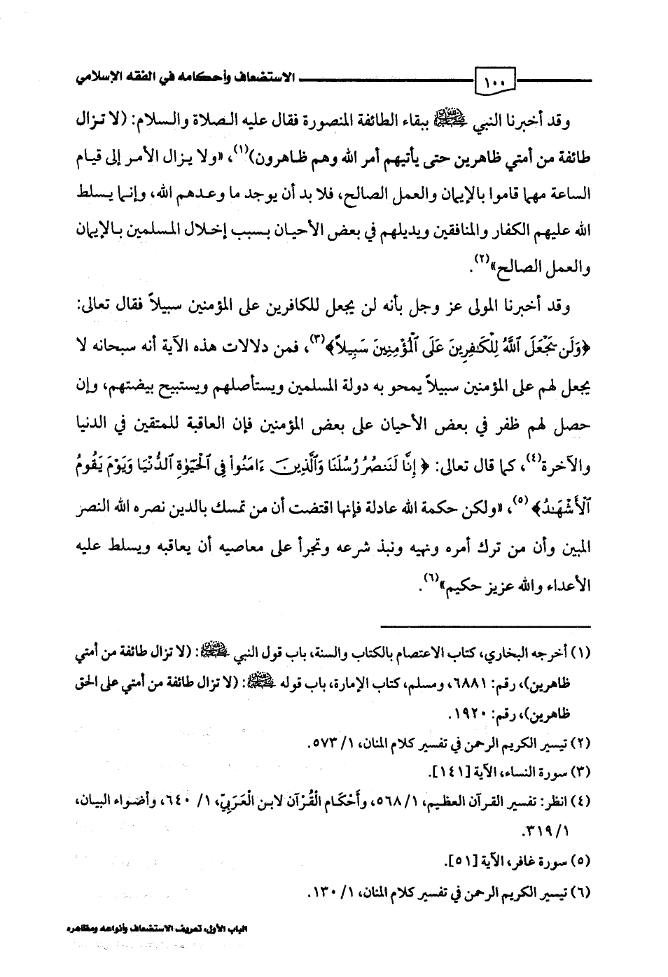 وقد أخبرنا النبي -صلى اللَّه عليه وسلم- ببقاء الطائفة المنصورة فقال عليه الصلاة والسلام: (لا تزال طائفة من أمتي ظاهرين حتى يأتيهم أمر اللَّه وهم ظاهرون) (¬1)، "ولا يزال الأمر إلى قيام الساعة مهما قاموا بالإيمان والعمل الصالح، فلا بد أن يوجد ما وعدهم اللَّه، وإنما يسلط اللَّه عليهم الكفار والمنافقين ويديلهم في بعض الأحيان بسبب إخلال المسلمين بالإيمان والعمل الصالح" (¬2).