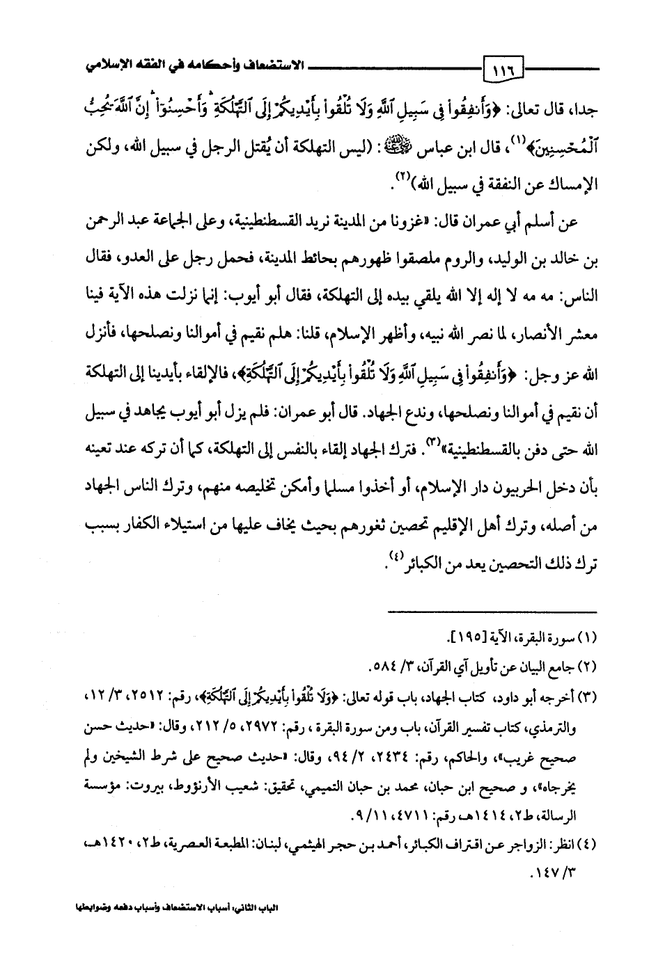 (¬3) أخرجه أبو داود، كتاب الجهاد، باب قوله تعالى: {وَلَا تُلْقُوا بِأَيْدِيكُمْ إِلَى التَّهْلُكَةِ}، رقم: 2512، 3/ 12، والترمذي، كتاب تفسير القرآن، باب ومن سورة البقرة، رقم: 2972، 5/ 212، وقال: "حديث حسن صحيح غريب"، والحاكم، رقم: 2434، 2/ 94، وقال: "حديث صحيح على شرط الشيخين ولم يخرجاه"، وصحيح ابن حبان، محمد بن حبان التميمي، تحقيق: شعيب الأرنؤوط، بيروت: مؤسسة الرسالة، ط 2، 1414 هـ، رقم: 4711، 11/ 9.