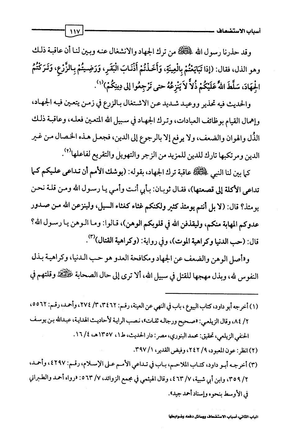 وقد حذرنا رسول اللَّه -صلى اللَّه عليه وسلم- من ترك الجهاد والانشغال عنه وبين لنا أن عاقبة ذلك وهو الذل، فقال: (إذا تَبَايَعْتُمْ بِالْعِينَةِ، وَأَخَذْتُمْ أَذْنَابَ الْبَقَرِ، وَرَضِيتُمْ بِالزَّرْعِ، وَتَرَكْتُمُ الْجِهَادَ، سَلَّطَ اللَّه عَلَيْكُمْ ذُلًّا لَا يَنْزِعُهُ حتى تَرْجِعُوا إلى دِينِكُمْ) (¬1).