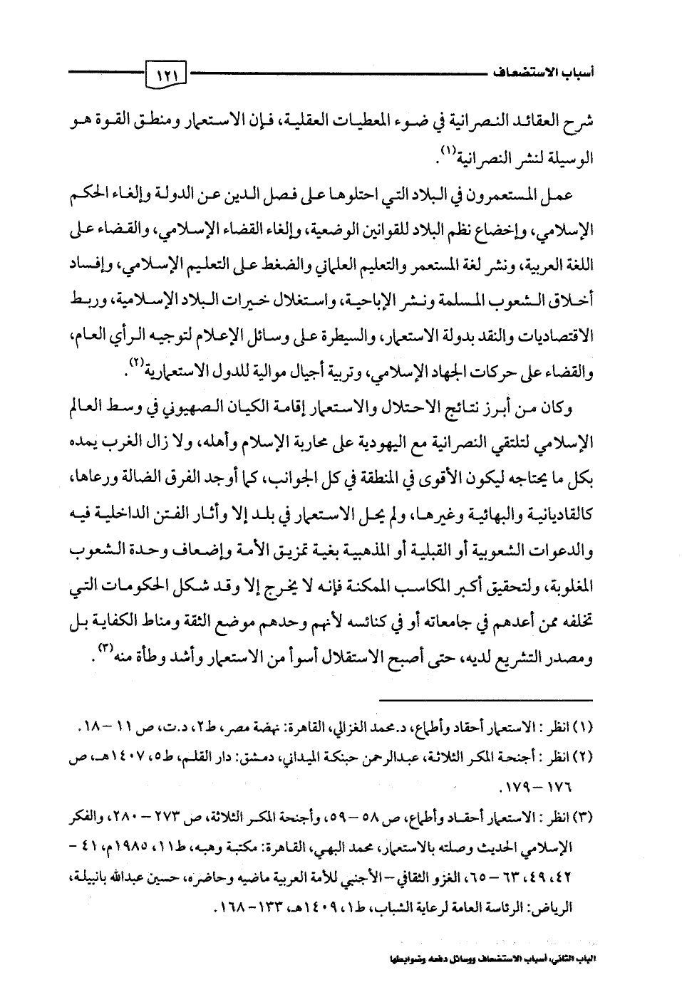 (¬3) انظر: الاستعمار أحقاد وأطماع، ص 58 - 59، وأجنحة المكر الثلاثة، ص 273 - 280، والفكر الإسلامي الحديث وصلته بالاستعمار، محمد البهي، القاهرة: مكتبة وهبه، ط 11، 1985 م، 41 - 42، 49، 63 - 65، الغزو الثقافي - الأجنبي للأمة العربية ماضيه وحاضره، حسين عبد اللَّه بانبيلة، الرياض: الرئاسة العامة لرعاية الشباب، ط 1، 1409 هـ، 133 - 168.