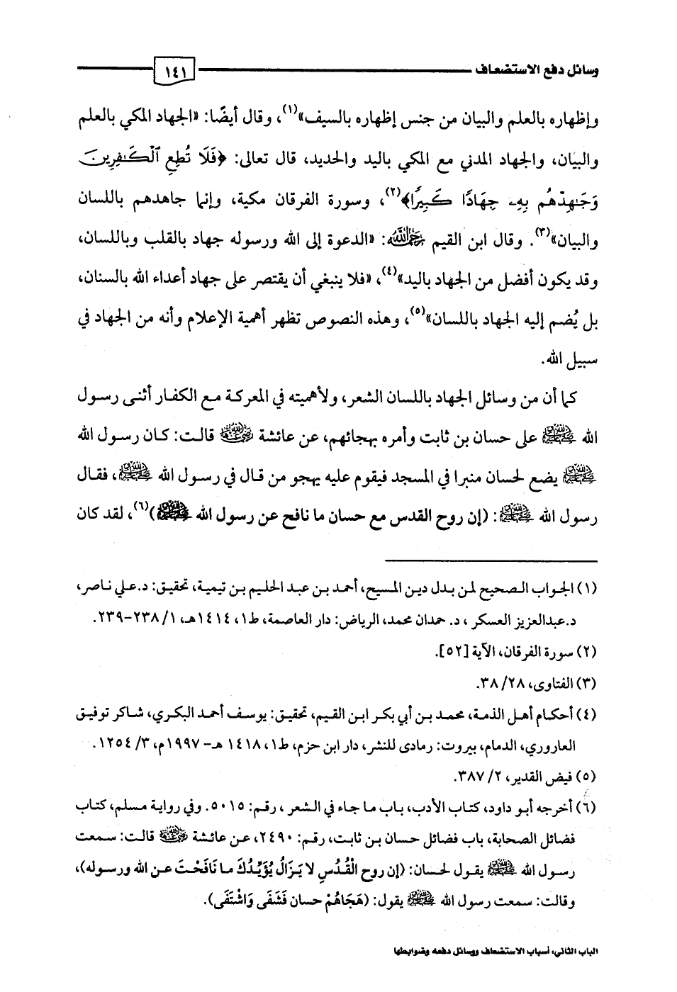 وإظهاره بالعلم والبيان من جنس إظهاره بالسيف" (¬1)، وقال أيضًا: "الجهاد المكي بالعلم والبيان، والجهاد المدني مع المكي باليد والحديد، قال تعالى: {فَلَا تُطِعِ الْكَافِرِينَ وَجَاهِدْهُمْ بِهِ جِهَادًا كَبِيرًا} (¬2)، وسورة الفرقان مكية، وإنما جاهدهم باللسان والبيان" (¬3). وقال ابن القيم رحمه اللَّه: "الدعوة إلى اللَّه ورسوله جهاد بالقلب وباللسان، وقد يكون أفضل من الجهاد باليد" (¬4)، "فلا ينبغي أن يقتصر على جهاد أعداء اللَّه بالسنان، بل يُضم إليه الجهاد باللسان" (¬5)، وهذه النصوص تظهر أهمية الإعلام وأنه من الجهاد في سبيل اللَّه.