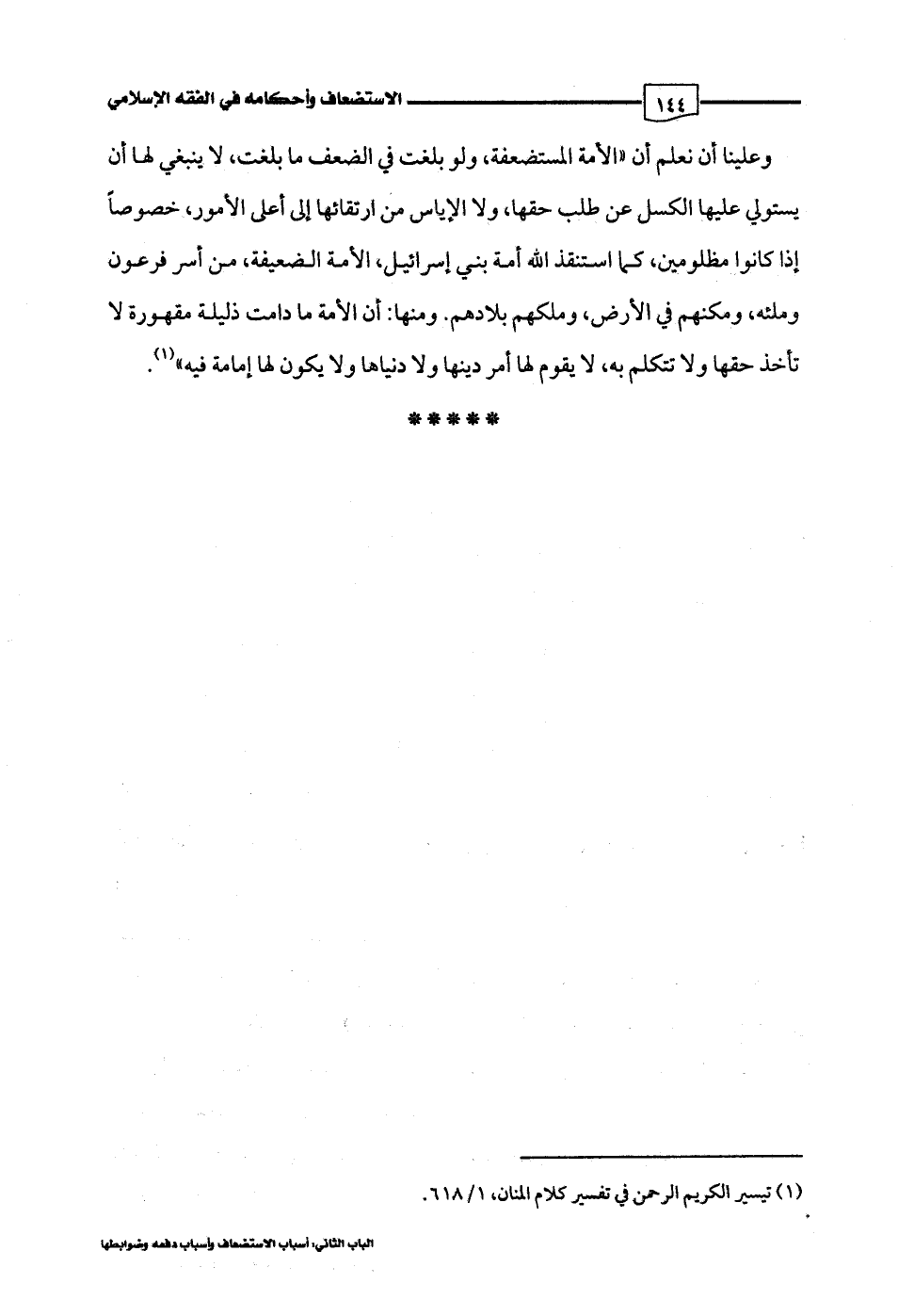 وعلينا أن نعلم أن "الأمة المستضعفة، ولو بلغت في الضعف ما بلغت، لا ينبغي لها أن يستولي عليها الكسل عن طلب حقها، ولا الإياس من ارتقائها إلى أعلى الأمور، خصوصًا إذا كانوا مظلومين، كما استنقذ اللَّه أمة بني إسرائيل، الأمة الضعيفة، من أسر فرعون وملئه، ومكنهم في الأرض، وملكهم بلادهم. ومنها: أن الأمة ما دامت ذليلة مقهورة لا تأخذ حقها ولا تتكلم به، لا يقوم لها أمر دينها ولا دنياها ولا يكون لها إمامة فيه" (¬1).