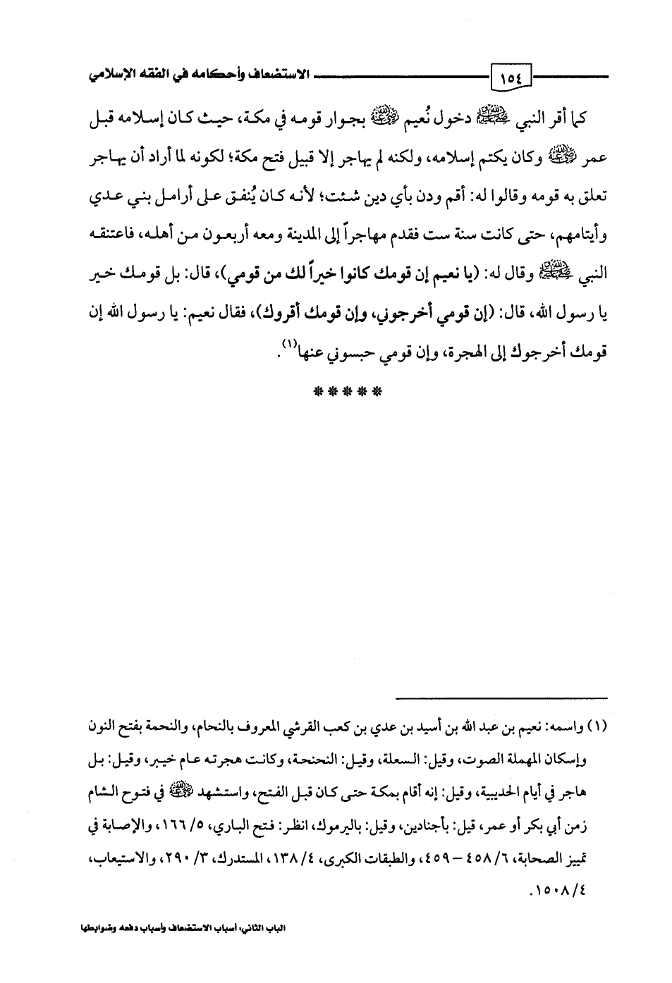 كما أقر النبي -صلى اللَّه عليه وسلم- دخول نُعيم -رضي اللَّه عنه- بجوار قومه في مكة، حيث كان إسلامه قبل عمر -رضي اللَّه عنه- وكان يكتم إسلامه، ولكنه لم يهاجر إلا قبيل فتح مكة؛ لكونه لما أراد أن يهاجر تعلق به قومه وقالوا له: أقم ودن بأي دين شئت؛ لأنه كان يُنفق على أرامل بني عدي وأيتامهم، حتى كانت سنة ست فقدم مهاجرًا إلى المدينة ومعه أربعون من أهله، فاعتنقه النبي -صلى اللَّه عليه وسلم- وقال له: (يا نعيم إن قومك كانوا خيرًا لك من قومي)، قال: بل قومك خير يا رسول اللَّه، قال: (إن قومي أخرجوني، وإن قومك أقروك)، فقال نعيم: يا رسول اللَّه إن قومك أخرجوك إلى الهجرة, وإن قومي حبسوني عنها (¬1).