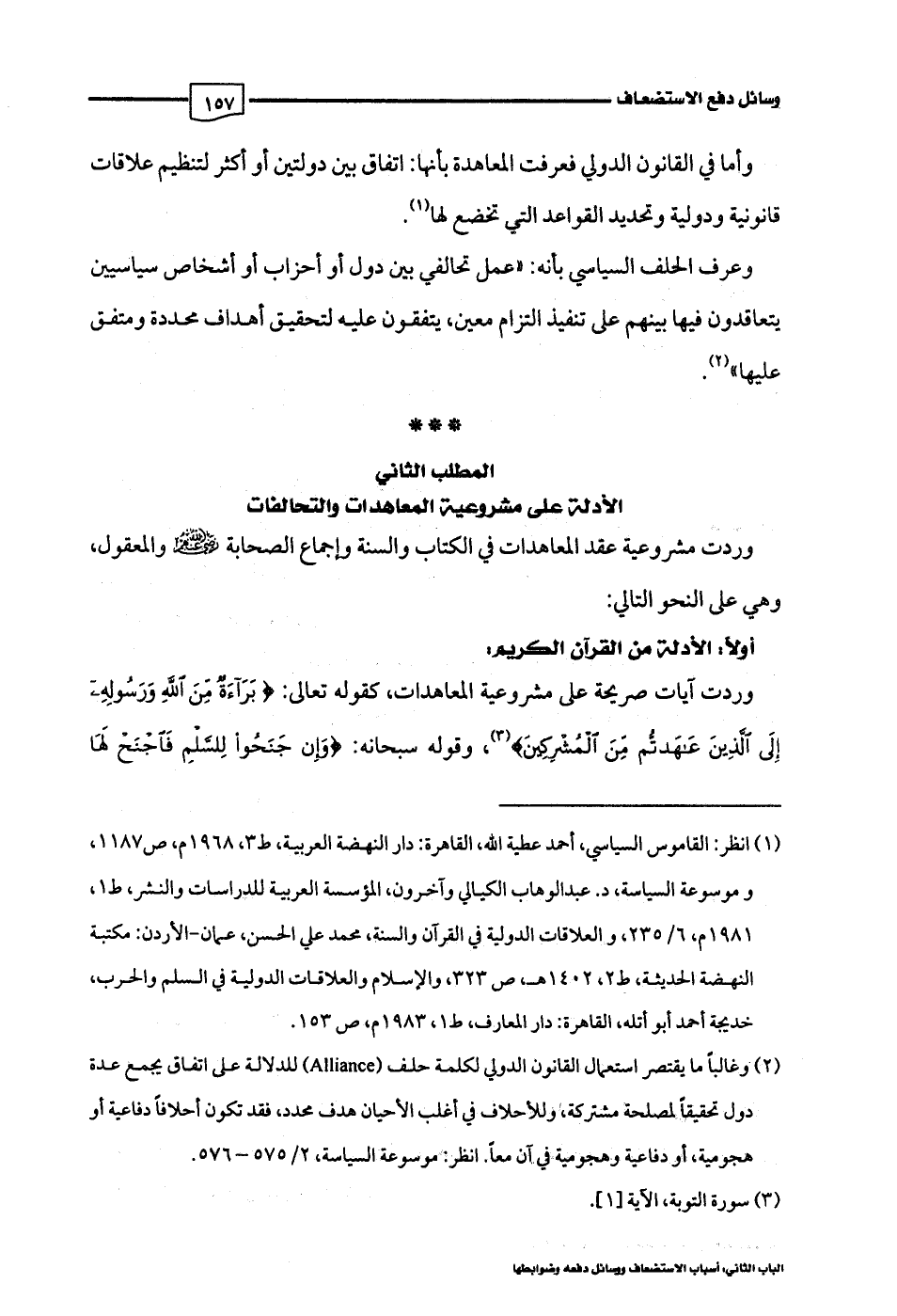 (¬1) انظر: القاموس السياسي، أحمد عطية اللَّه، القاهرة: دار النهضة العربية، ط 3، 1968 م، ص 1187، وموسوعة السياسة، د. عبد الوهاب الكيالي وآخرون، المؤسسة العربية للدراسات والنشر، ط 1، 1981 م، 6/ 235، والعلاقات الدولية في القرآن والسنة، محمد علي الحسن، عمان - الأردن: مكتبة النهضة الحديثة، ط 2، 1402 هـ، ص 323، والإسلام والعلاقات الدولية في السلم والحرب، خديجة أحمد أبو أتله، القاهرة: دار المعارف، ط 1، 1983 م، ص 153.