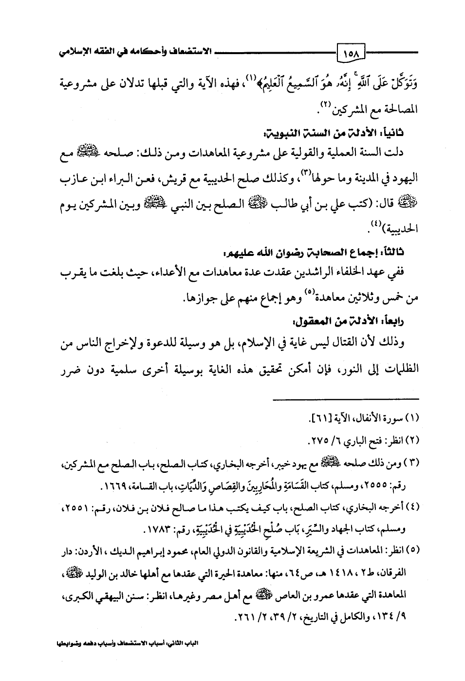 (¬5) انظر: المعاهدات في الشريعة الإسلامية والقانون الدولي العام، محمود إبراهيم الديك، الأردن: دار الفرقان، ط 2، 1418 هـ، ص 64، منها: معاهدة الحيرة التي عقدها مع أهلها خالد بن الوليد -رضي اللَّه عنه-، المعاهدة التي عقدها عمرو بن العاص -رضي اللَّه عنه- مع أهل مصر وغيرها، انظر: سنن البيهقي الكبرى، 9/ 134، والكامل في التاريخ، 2/ 39، 2/ 261.