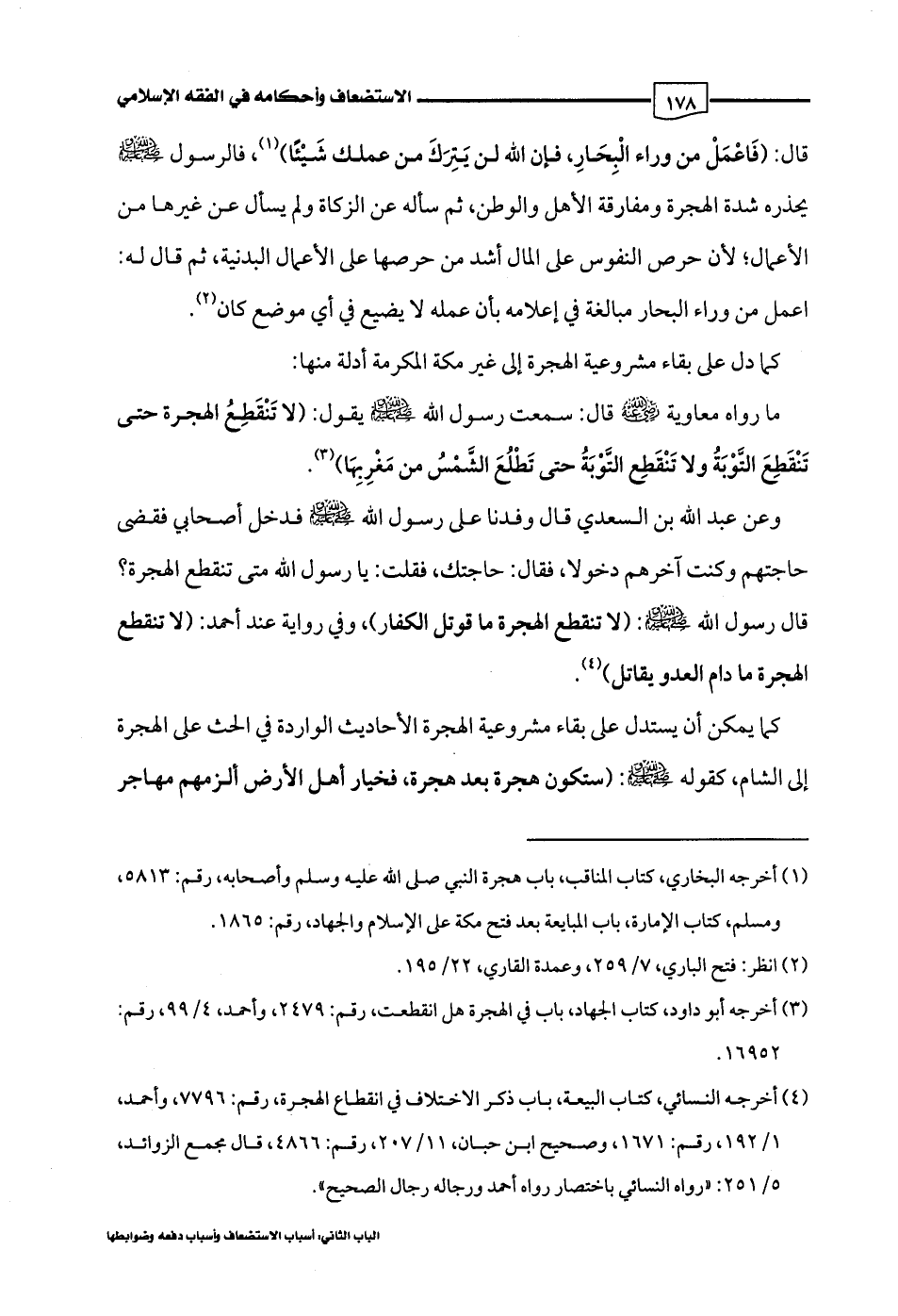 كما يمكن أن يستدل على بقاء مشروعية الهجرة الأحاديث الواردة في الحث على الهجرة إلى الشام، كقوله -صلى اللَّه عليه وسلم-: (ستكون هجرة بعد هجرة، فخيار أهل الأرض ألزمهم مهاجر