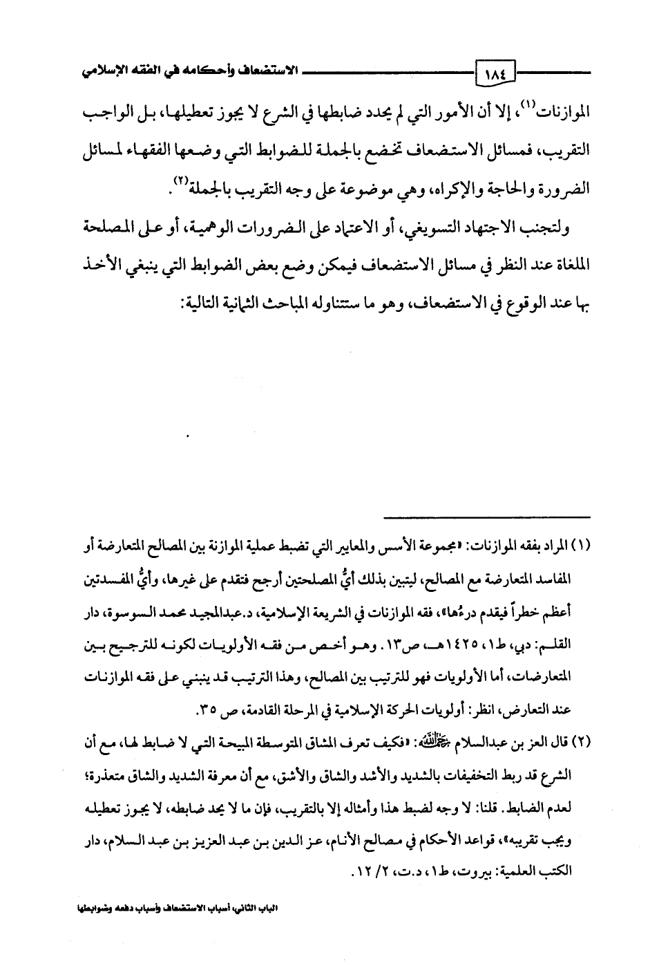 (¬1) المراد بفقه الموازنات: "مجموعة الأسس والمعايير التي تضبط عملية الموازنة بين المصالح المتعارضة أو المفاسد المتعارضة مع المصالح، ليتبين بذلك أيُّ المصلحتين أرجح فتقدم على غيرها، وأيُّ المفسدتين أعظم خطرًا فيقدم درءُها"، فقه الموازنات في الشريعة الاسلامية، د. عبد المجيد محمد السوسوة، دار القلم: دبي، ط 1، 1425 هـ، ص 13. وهو أخص من فقه الأولويات لكونه للترجيح بين المتعارضات، أما الأولويات فهو للترتيب بين المصالح، وهذا الترتيب قد ينبني على فقه الموازنات عند التعارض، انظر: أولويات الحركة الإسلامية في المرحلة القادمة، ص 35.