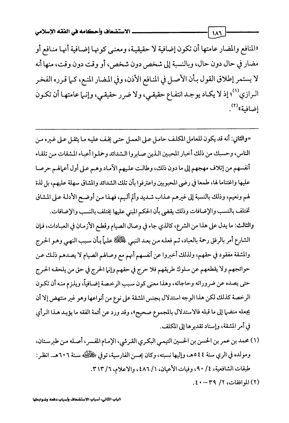 = والثاني: أنه قد يكون للعامل المكلف حامل على العمل حتى يخف عليه ما يثقل على غيره من الناس، وحسبك من ذلك أخبار المحبين الذين صابروا الشدائد وحملوا أعباء المشقات من تلقاء أنفسهم من إتلاف مهجهم إلى ما دون ذلك، وطالت عليهم الآماد وهم على أول أعمالهم حرصا عليها واغتناما لها، طمعا في رضى المحبوبين واعترفوا بأن تلك الشدائد والمشاق سهلة عليهم، بل لذة لهم ونعيم، وذلك بالنسبة إلى غيرهم عذاب شديد وألم أليم، فهذا من أوضح الأدلة على المشاق تختلف بالنسب والإضافات وذلك يقضى بأن الحكم المبني عليها يختلف بالنسب والإضافات.