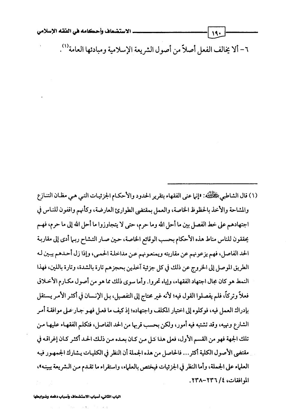 (¬1) قال الشاطبي رحمه اللَّه: "إنما عنى الفقهاء بتقرير الحدود والأحكام الجزئيات التي هي مظان التنازع والمشاحة والأخذ بالحظوظ الخاصة، والعمل بمقتضى الطوارىء العارضة، وكأنهم واقفون للناس في اجتهادهم على خط الفصل بين ما أحل اللَّه وما حرم، حتى لا يتجاوزوا ما أحل اللَّه إلى ما حرم، فهم يحققون للناس مناط هذه الأحكام بحسب الوقائع الخاصة، حين صار التشاح ربما أدى إلى مقاربة الحد الفاصل، فهم يزعونهم عن مقاربته ويمنعونهم عن مداخلة الحمى، وإذا زل أحدهم يبين له الطريق الموصل إلى الخروج عن ذلك في كل جزئية آخذين بحجزهم تارة بالشدة، وتارة باللين، فهذا النمط هو كان مجال اجتهاد الفقهاء، وإياه تحروا. وأما سوى ذلك مما هو من أصول مكارم الأخلاق فعلًا وتركًا، فلم يفصلوا القول فيه؛ لأنه غير محتاج إلى التفصيل، بل الإنسان في أكثر الأمر يستقل بإدراك العمل فيه، فوكلوه إلى اختيار المكلف واجتهاده؛ إذ كيف ما فعل فهو جار على موافقة أمر الشارع ونهيه، وقد تشبه فيه أمور، ولكن بحسب قربها من الحد الفاصل، فتكلم الفقهاء عليها من تلك الجهة فهو من القسم الأول، فعلى هذا كل من كان بعده من ذلك الحد أكثر كان إغراقه في مقتضى الأصول الكلية أكثر. . . فالحاصل من هذه الجملة أن النظر في الكليات يشارك الجمهور فيه العلماء على الجملة، وأما النظر في الجزئيات فيختص بالعلماء، واستقراء ما تقدم من الشريعة يبينه"، الموافقات، 4/ 236 - 238.