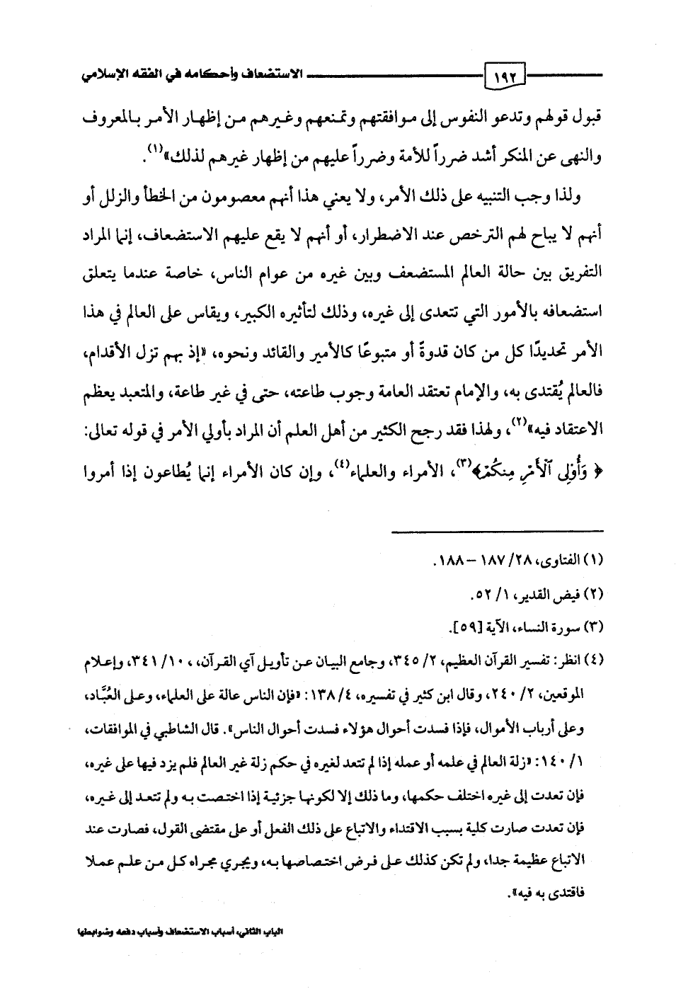 ولذا وجب التنبيه على ذلك الأمر، ولا يعني هذا أنهم معصومون من الخطأ والزلل أو أنهم لا يباح لهم الترخص عند الاضطرار، أو أنهم لا يقع عليهم الاستضعاف، إنما المراد التفريق بين حالة العالم المستضعف وبين غيره من عوام الناس، خاصة عندما يتعلق استضعافه بالأمور التي تتعدى إلى غيره، وذلك لتأثيره الكبير، ويقاس على العالم في هذا الأمر تحديدًا كل من كان قدوةً أو متبوعًا كالأمير والقائد ونحوه، "إذ بهم تزل الأقدام، فالعالم يُقتدى به، والإمام تعتقد العامة وجوب طاعته، حتى في غير طاعة، والمتعبد يعظم الاعتقاد فيه" (¬2)، ولهذا فقد رجح الكثير من أهل العلم أن المراد بأولي الأمر في قوله تعالى: {وَأُولِي الْأَمْرِ مِنْكُمْ} (¬3)، الأمراء والعلماء (¬4)، وإن كان الأمراء إنما يُطاعون إذا أمروا