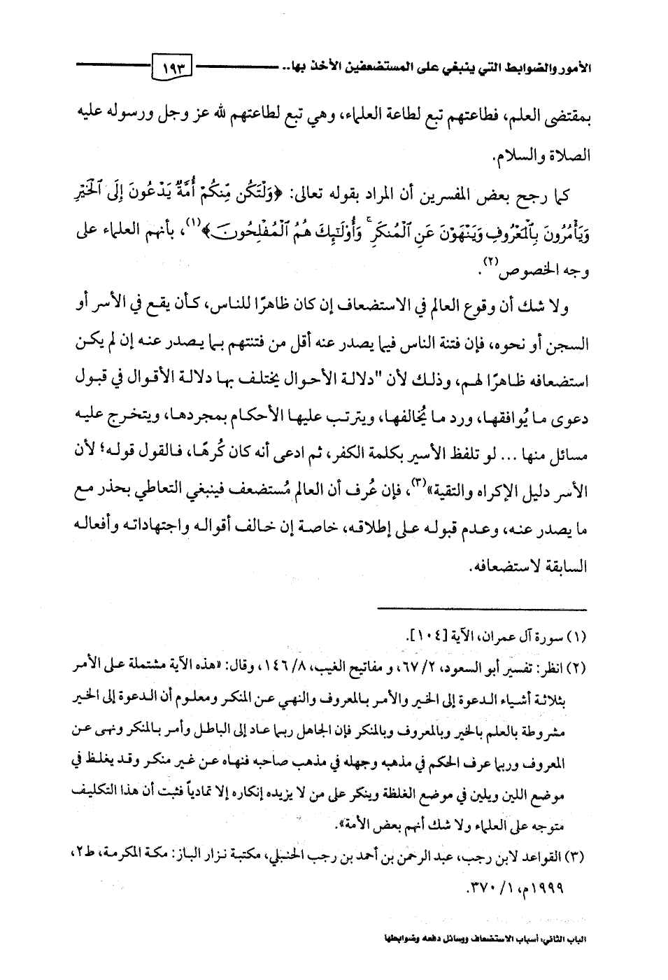 (¬2) انظر: تفسير أبو السعود، 2/ 67، ومفاتيح الغيب، 8/ 146، وقال: "هذه الآية مشتملة على الأمر بثلاثة أشياء الدعوة إلى الخير والأمر بالمعروف والنهي عن المنكر ومعلوم أن الدعوة إلى الخير مشروطة بالعلم بالخير وبالمعروف وبالمنكر فإن الجاهل ربما عاد إلى الباطل وأمر بالمنكر ونهى عن المعروف وربما عرف الحكم في مذهبه وجهله في مذهب صاحبه فنهاه عن غير منكر وقد يغلظ في موضع اللين ويلين في موضع الغلظة وينكر على من لا يزيده إنكاره إلا تماديًا فثبت أن هذا التكليف متوجه على العلماء ولا شك أنهم بعض الأمة".