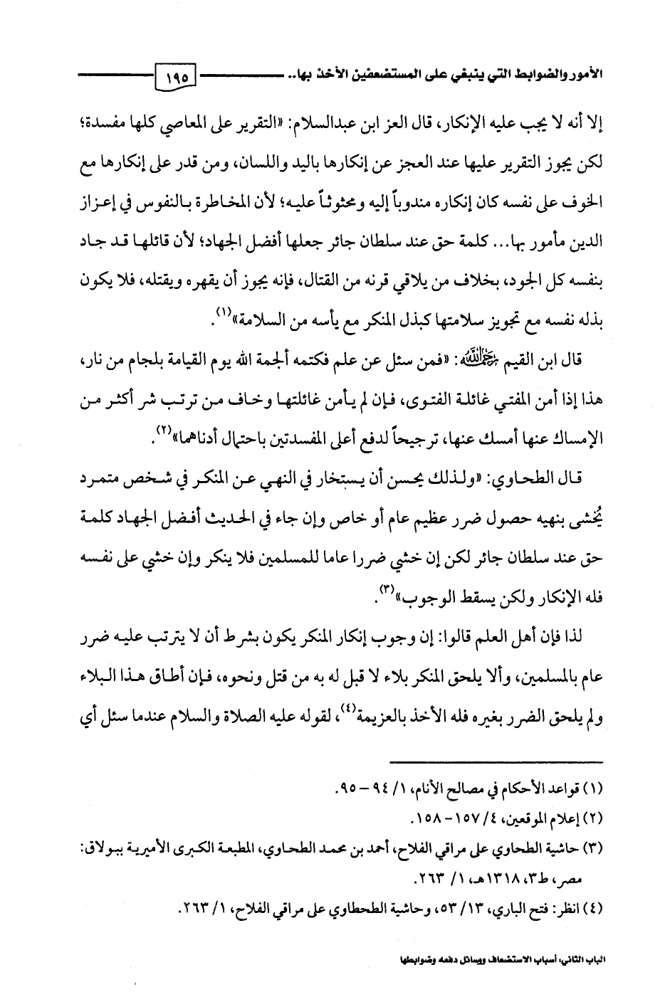 قال الطحاوي: "ولذلك يحسن أن يستخار في النهي عن المنكر في شخص متمرد يُخشى بنهيه حصول ضرر عظيم عام أو خاص وإن جاء في الحديث أفضل الجهاد كلمة حق عند سلطان جائر لكن إن خشي ضررا عاما للمسلمين فلا ينكر وإن خشي على نفسه فله الإنكار ولكن يسقط الوجوب" (¬3).