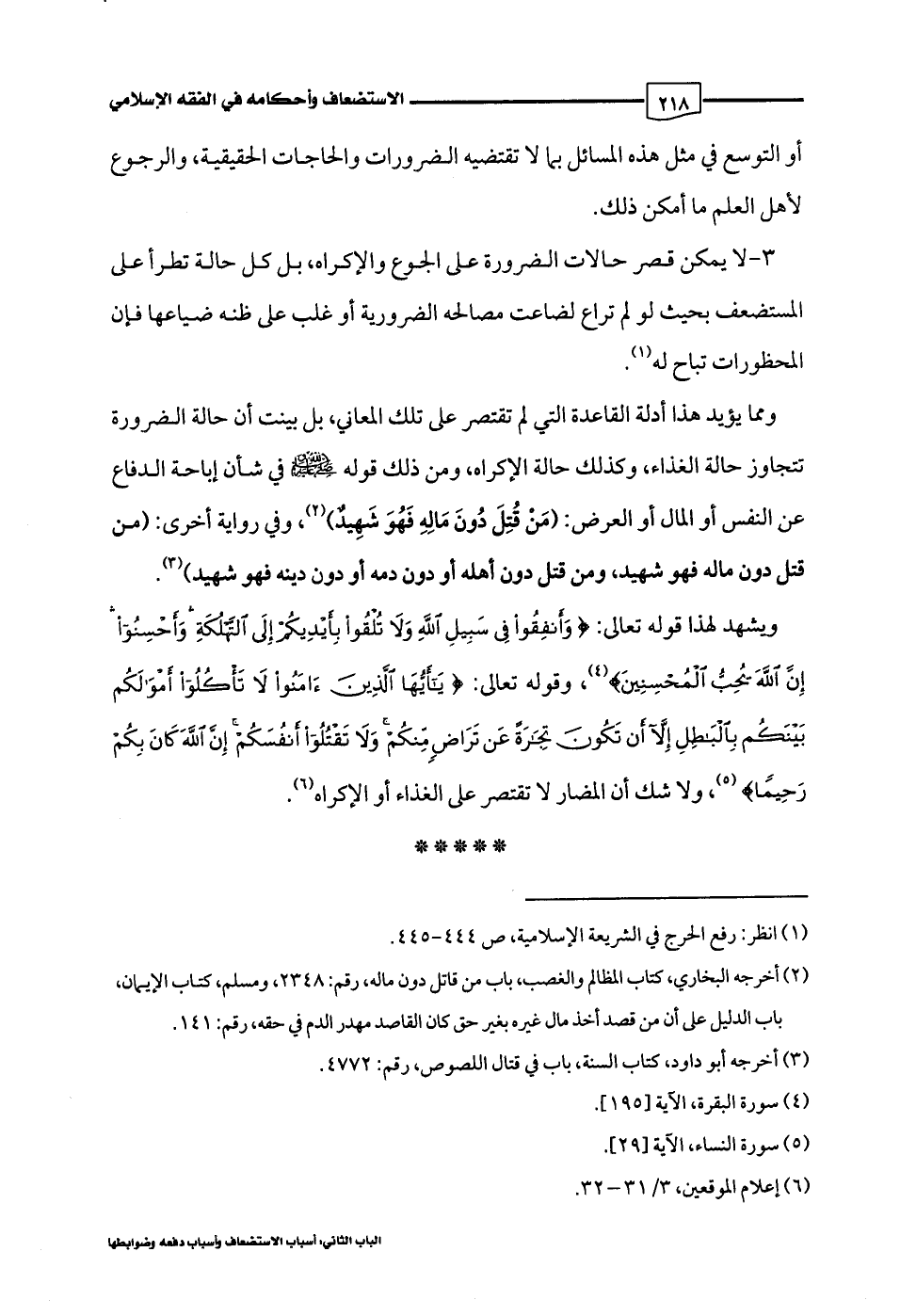 ومما يؤيد هذا أدلة القاعدة التي لم تقتصر على تلك المعاني، بل بينت أن حالة الضرورة تتجاوز حالة الغذاء، وكذلك حالة الإكراه، ومن ذلك قوله -صلى اللَّه عليه وسلم- في شأن إباحة الدفاع عن النفس أو المال أو العرض: (مَنْ قُتِلَ دُونَ مَالِهِ فَهُوَ شَهِيدٌ) (¬2)، وفي رواية أخرى: (من قتل دون ماله فهو شهيد، ومن قتل دون أهله أو دون دمه أو دون دينه فهو شهيد) (¬3).