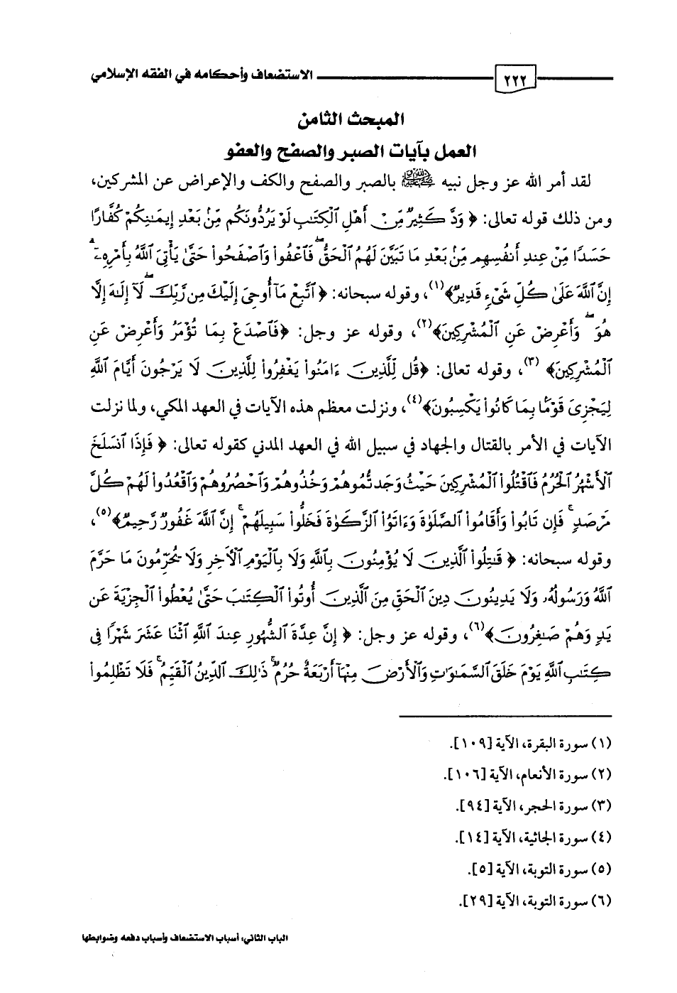 لقد أمر اللَّه عز وجل نبيه -صلى اللَّه عليه وسلم- بالصبر والصفح والكف والإعراض عن المشركين، ومن ذلك قوله تعالى: {وَدَّ كَثِيرٌ مِنْ أَهْلِ الْكِتَابِ لَوْ يَرُدُّونَكُمْ مِنْ بَعْدِ إِيمَانِكُمْ كُفَّارًا حَسَدًا مِنْ عِنْدِ أَنْفُسِهِمْ مِنْ بَعْدِ مَا تَبَيَّنَ لَهُمُ الْحَقُّ فَاعْفُوا وَاصْفَحُوا حَتَّى يَأْتِيَ اللَّهُ بِأَمْرِهِ إِنَّ اللَّهَ عَلَى كُلِّ شَيْءٍ قَدِير} (¬1)، وقوله سبحانه: {اتَّبِعْ مَا أُوحِيَ إِلَيْكَ مِنْ رَبِّكَ لَا إِلَهَ إِلَّا هُوَ وَأَعْرِضْ عَنِ الْمُشْرِكِينَ} (¬2)، وقوله عز وجل: {فَاصْدَعْ بِمَا تُؤْمَرُ وَأَعْرِضْ عَنِ الْمُشْرِكِينَ} (¬3)، وقوله تعالى: {قُلْ لِلَّذِينَ آمَنُوا يَغْفِرُوا لِلَّذِينَ لَا يَرْجُونَ أَيَّامَ اللَّهِ لِيَجْزِيَ قَوْمًا بِمَا كَانُوا يَكْسِبُونَ} (¬4)، ونزلت معظم هذه الآيات في العهد المكي، ولما نزلت الآيات في الأمر بالقتال والجهاد في سبيل اللَّه في العهد المدني كقوله تعالى: {فَإِذَا انْسَلَخَ الْأَشْهُرُ الْحُرُمُ فَاقْتُلُوا الْمُشْرِكِينَ حَيْثُ وَجَدْتُمُوهُمْ وَخُذُوهُمْ وَاحْصُرُوهُمْ وَاقْعُدُوا لَهُمْ كُلَّ مَرْصَدٍ فَإِنْ تَابُوا وَأَقَامُوا الصَّلَاةَ وَآتَوُا الزَّكَاةَ فَخَلُّوا سَبِيلَهُمْ إِنَّ اللَّهَ غَفُورٌ رَحِيمٌ} (¬5)، وقوله سبحانه: {قَاتِلُوا الَّذِينَ لَا يُؤْمِنُونَ بِاللَّهِ وَلَا بِالْيَوْمِ الْآخِرِ وَلَا يُحَرِّمُونَ مَا حَرَّمَ اللَّهُ وَرَسُولُهُ وَلَا يَدِينُونَ دِينَ الْحَقِّ مِنَ الَّذِينَ أُوتُوا الْكِتَابَ حَتَّى يُعْطُوا الْجِزْيَةَ عَنْ يَدٍ وَهُمْ صَاغِرُونَ} (¬6)، وقوله عز وجل: {إِنَّ عِدَّةَ الشُّهُورِ عِنْدَ اللَّهِ اثْنَا عَشَرَ شَهْرًا فِي كِتَابِ اللَّهِ يَوْمَ خَلَقَ السَّمَاوَاتِ وَالْأَرْضَ مِنْهَا أَرْبَعَةٌ حُرُمٌ ذَلِكَ الدِّينُ الْقَيِّمُ فَلَا تَظْلِمُوا