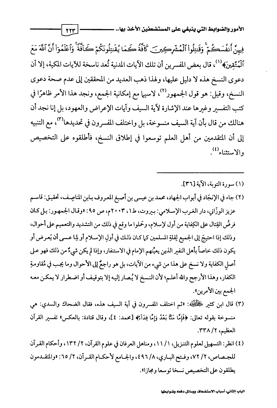(¬2) جاء في الإنجَاد في أبواب الجهاد، محمد بن عيسى بن أصبغ المعروف بابن المناصِف، تحقيق: قاسم عزيز الوزّاني، دار الغرب الإسلامي: بيروت، ط 1، 2003 م، ص 95: "وقال الجمهور: بل كان فرضُ القِتال على الكِفاية من أول الإسلام، وحَملوا ما وقع في ذلك من التشديد والتعميم على أحوال، وذلك إذا احتيجَ إلى الجميع لِقلةِ المسلمين كما كان ذلك في أولِ الإسلام أو لما عسى أن يَعرض أو يكون ذلك خاصًا بأهل النفير الذين يعيِّنهم الإمام في الاستنفار، وإذا لم يكن شيءٌ من ذلك فهو على أصلِ الكفاية ولا نسخ على هذا من شيء من الآيات، بل هو راجعٌ إلى الأحوال وما يجب في مُقاومةِ الكفار، وهذا الأرجح واللَّه أعلم؛ لأن النسخ لا يُصار إليه إلا بتوقيف أو اضطرار لا يمكن معه الجمع بين الأمرين".