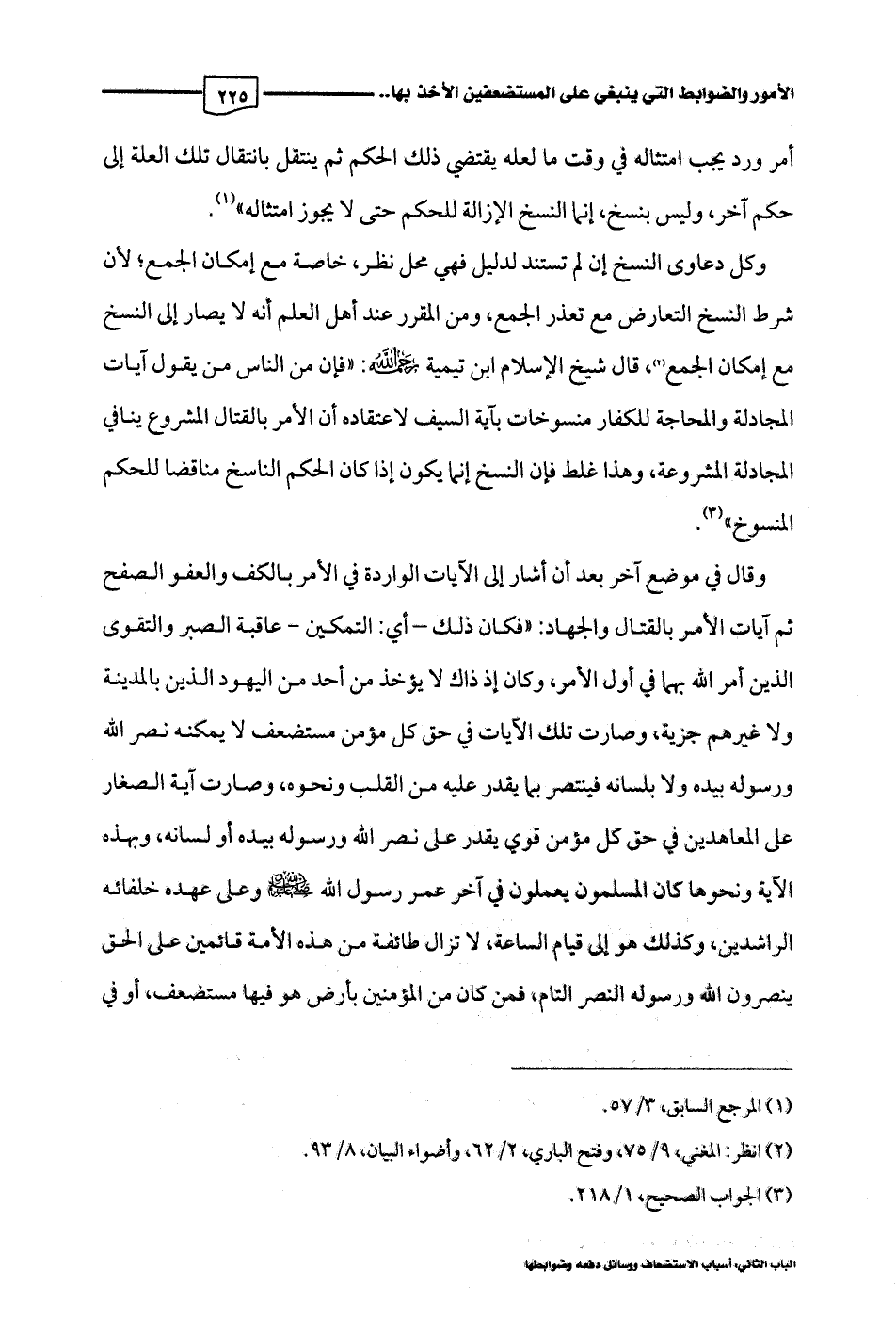 وقال في موضع آخر بعد أن أشار إلى الآيات الواردة في الأمر بالكف والعفو الصفح ثم آيات الأمر بالقتال والجهاد: "فكان ذلك -أي: التمكين- عاقبة الصبر والتقوى الذين أمر اللَّه بهما في أول الأمر، وكان إذ ذاك لا يؤخذ من أحد من اليهود الذين بالمدينة ولا غيرهم جزية، وصارت تلك الآيات في حق كل مؤمن مستضعف لا يمكنه نصر اللَّه ورسوله بيده ولا بلسانه فينتصر بما يقدر عليه من القلب ونحوه، وصارت آية الصغار على المعاهدين في حق كل مؤمن قوي يقدر على نصر اللَّه ورسوله بيده أو لسانه، وبهذه الآية ونحوها كان المسلمون يعملون في آخر عمر رسول اللَّه -صلى اللَّه عليه وسلم- وعلى عهده خلفائه الراشدين، وكذلك هو إلى قيام الساعة، لا تزال طائفة من هذه الأمة قائمين على الحق ينصرون اللَّه ورسوله النصر التام، فمن كان من المؤمنين بأرض هو فيها مستضعف، أو في
