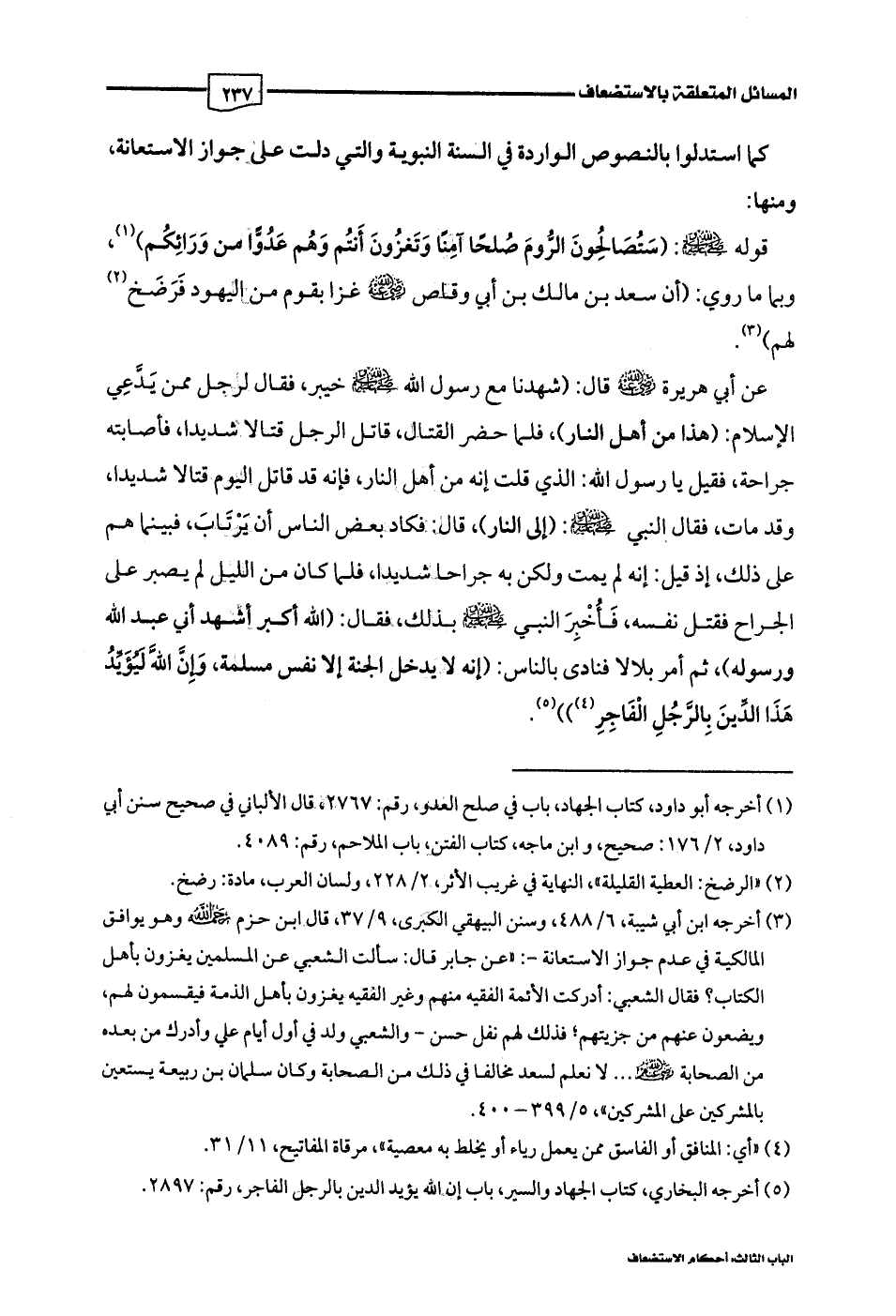 (¬3) أخرجه ابن أبي شيبة، 6/ 488، وسنن البيهقي الكبرى، 9/ 37، قال ابن حزم رحمه اللَّه وهو يوافق المالكية في عدم جواز الاستعانة -: "عن جابر قال: سألت الشعبي عن المسلمين يغزون بأهل الكتاب؟ فقال الشعبي: أدركت الأئمة الفقيه منهم وغير الفقيه يغزون بأهل الذمة فيقسمون لهم، ويضعون عنهم من جزيتهم؛ فذلك لهم نفل حسن- والشعبي ولد في أول أيام علي وأدرك من بعده من الصحابة -رضي اللَّه عنهم-. . . لا نعلم لسعد مخالفا في ذلك من الصحابة وكان سلمان بن ربيعة يستعين بالمشركين على المشركين"، 5/ 399 - 400.