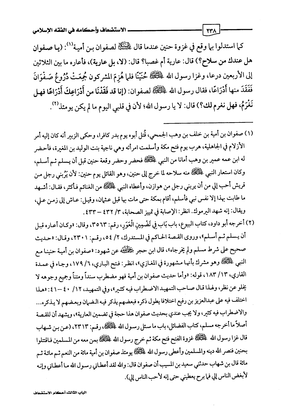 (¬2) أخرجه أبو داود، كتاب البيوع، باب بَاب فِي تَضْمِينِ الْعَوَرِ، رقم: 3563، وقال: "وكان أعاره قبل أن يسلم ثم أسلم"، وروى القصة الحاكم في المستدرك، 2/ 54، رقم: 2301، وقال: "حديث صحيح على شرط مسلم ولم يخرجاه"، قال ابن حجر رحمه اللَّه عن شهود: "صفوان بن أمية حنينا مع النبي -صلى اللَّه عليه وسلم- وهو مشرك بأنها مشهورة في المغازي"، انظر: فتح الباري، 6/ 179، وجاء في عمدة القاري، 13/ 183، قوله: "وأما حديث صفوان بن أمية فهو مضطرب سندًا ومتنًا وجميع وجوهه لا يخلو عن نظر، ولهذا قال صاحب التمهيد الاضطراب فيه كثير"، وفي التمهيد، 12/ 40 - 41: "هذا اختلف فيه على عبد العزيز بن رفيع اختلافا يطول ذكره فبعضهم يذكر فيه الضمان وبعضهم لا يذكره. . . والاضطراب فيه كثير، ولا يجب عندي بحديث صفوان هذا حجة في تضمين العارية"، ويشهد أن للقصة أصلًا ما أخرجه مسلم، كتاب الفضائل، باب ما سئل رسول اللَّه -صلى اللَّه عليه وسلم-، رقم: 2313، (عن بن شهاب قال غزا رسول اللَّه -صلى اللَّه عليه وسلم- غزوة الفتح فتح مكة ثم خرج رسول اللَّه -صلى اللَّه عليه وسلم- بمن معه من المسلمين فاقتتلوا بحنين فنصر اللَّه دينه والمسلمين وأعطى رسول اللَّه -صلى اللَّه عليه وسلم- يومئذ صفوان بن أمية مائة من النعم ثم مائة ثم مائة قال بن شهاب حدثني سعيد بن المسيب أن صفوان قال: واللَّه لقد أعطاني رسول اللَّه ما أعطاني وإنه لأبغض الناس إلي فما برح يعطيني حتى إنه لأحب الناس إلي).