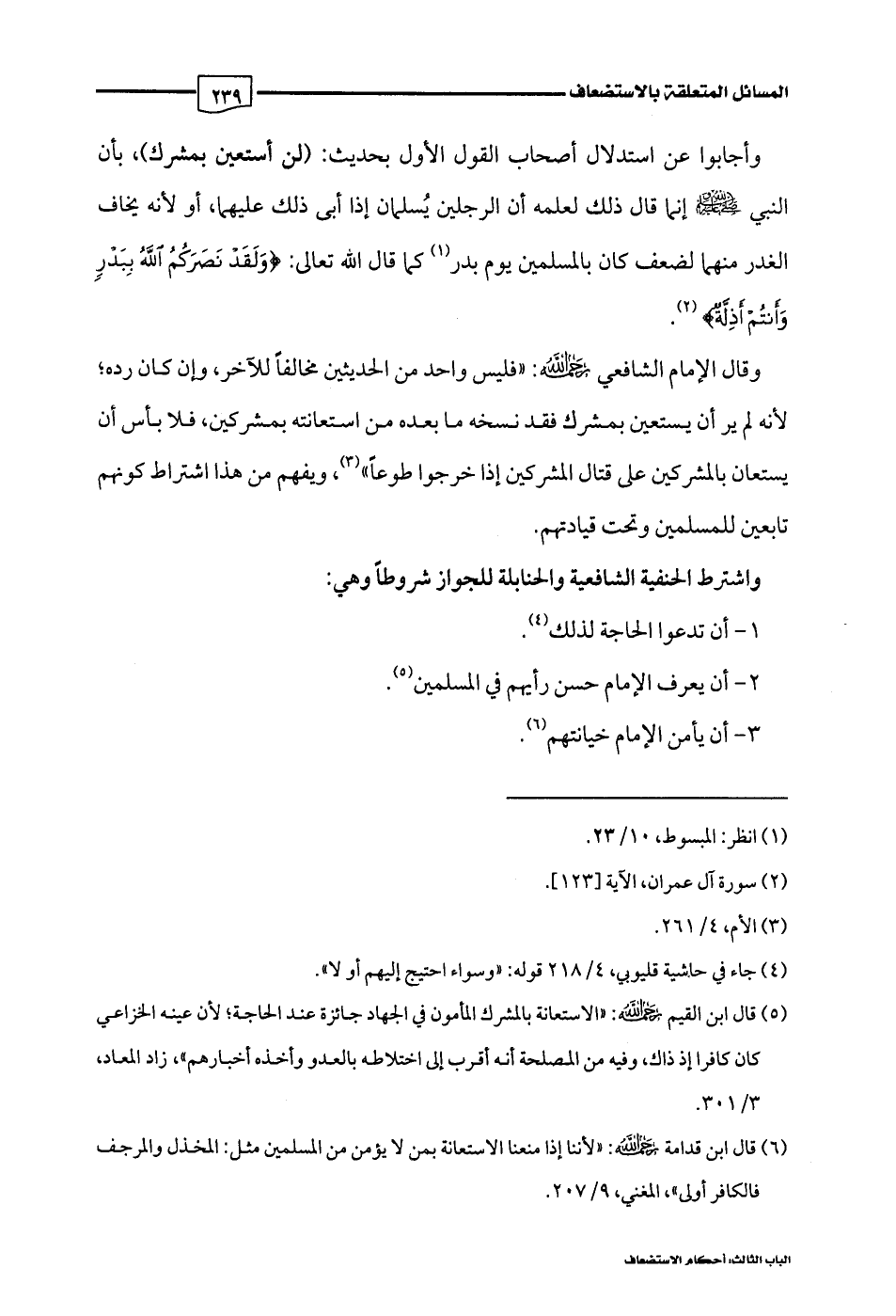 وأجابوا عن استدلال أصحاب القول الأول بحديث: (لن أستعين بمشرك)، بأن النبي -صلى اللَّه عليه وسلم- إنما قال ذلك لعلمه أن الرجلين يُسلمان إذا أبى ذلك عليهما، أو لأنه يخاف الغدر منهما لضعف كان بالمسلمين يوم بدر (¬1) كما قال اللَّه تعالى: {وَلَقَدْ نَصَرَكُمُ اللَّهُ بِبَدْرٍ وَأَنْتُمْ أَذِلَّةٌ} (¬2).