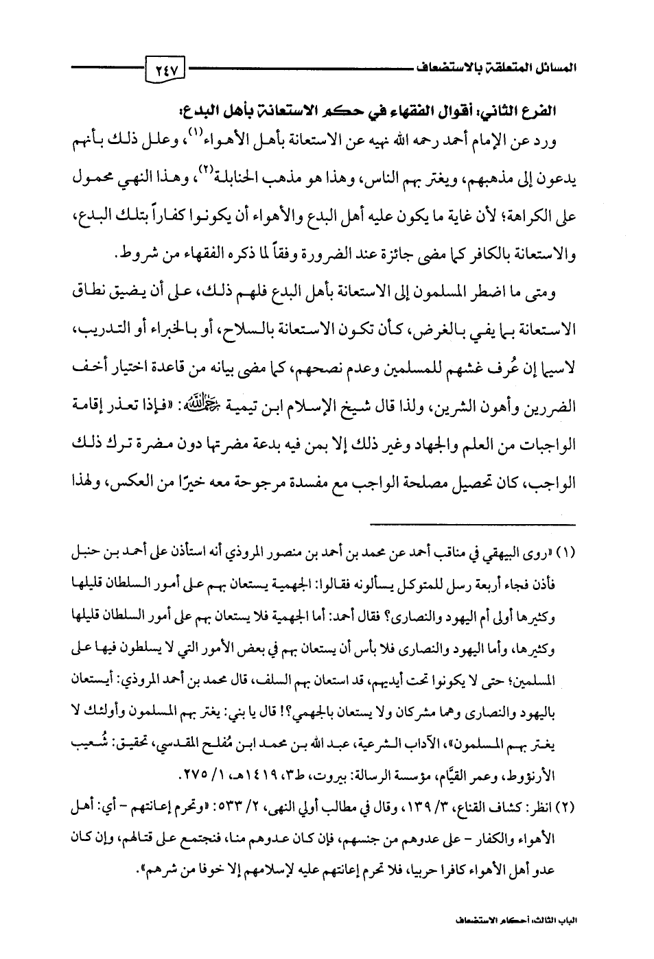 (¬2) انظر: كشاف القناع، 3/ 139، وقال في مطالب أولي النهى، 2/ 533: "وتحرم إعانتهم -أي: أهل الأهواء والكفار- على عدوهم من جنسهم، فإن كان عدوهم منا، فنجتمع على قتالهم، وإن كان عدو أهل الأهواء كافرا حربيا، فلا تحرم إعانتهم عليه لإسلامهم إلا خوفا من شرهم".