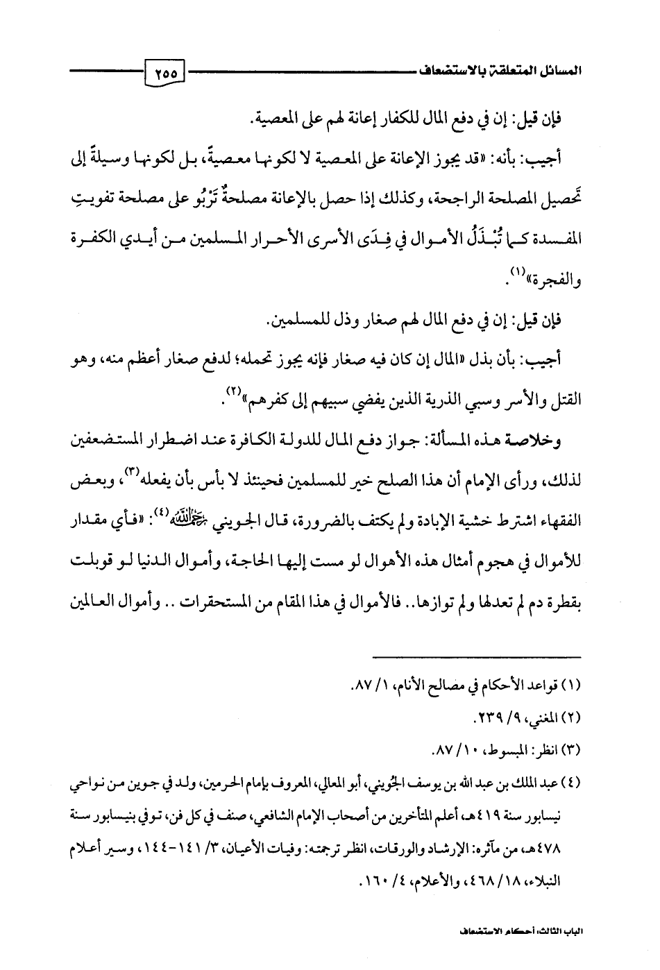 وخلاصة هذه المسألة: جواز دفع المال للدولة الكافرة عند اضطرار المستضعفين لذلك، ورأى الإمام أن هذا الصلح خير للمسلمين فحينئذ لا بأس بأن يفعله (¬3)، وبعض الفقهاء اشترط خشية الإبادة ولم يكتف بالضرورة، قال الجويني رحمه اللَّه (¬4): "فأي مقدار للأموال في هجوم أمثال هذه الأهوال لو مست إليها الحاجة، وأموال الدنيا لو قوبلت بقطرة دم لم تعدلها ولم توازها. . فالأموال في هذا المقام من المستحقرات. . وأموال العالمين