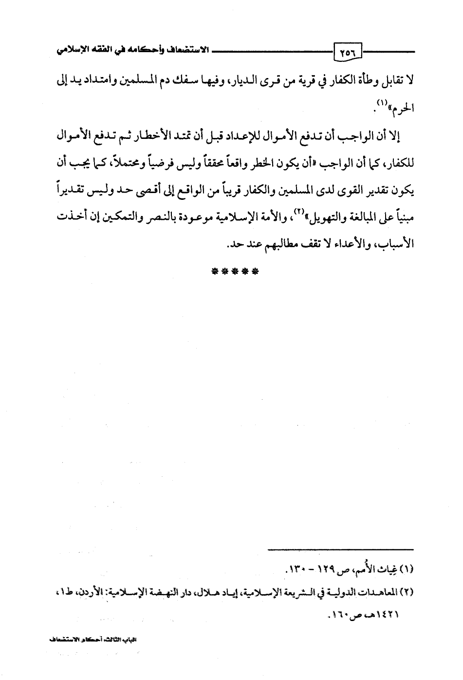 إلا أن الواجب أن تدفع الأموال للإعداد قبل أن تمتد الأخطار ثم تدفع الأموال للكفار، كما أن الواجب "أن يكون الخطر واقعًا محققًا وليس فرضيًا ومحتملًا، كما يجب أن يكون تقدير القوى لدى المسلمين والكفار قريبًا من الواقع إلى أقصى حد وليس تقديرًا مبنيًا على المبالغة والتهويل" (¬2)، والأمة الإسلامية موعودة بالنصر والتمكين إن أخذت الأسباب، والأعداء لا تقف مطالبهم عند حد.