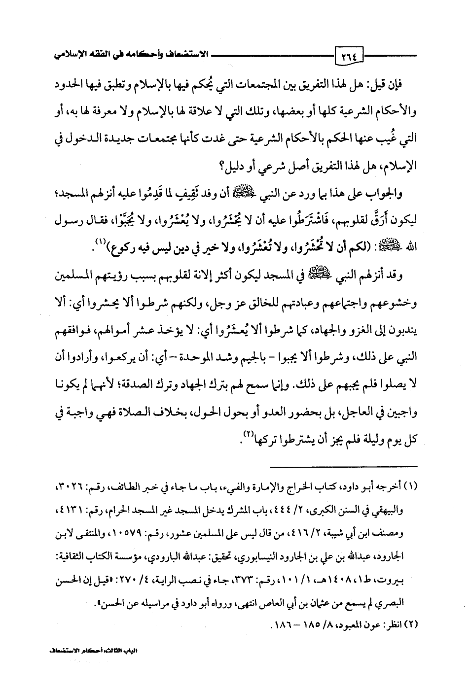 (¬1) أخرجه أبو داود، كتاب الخراج والإمارة والفيء، باب ما جاء في خبر الطائف، رقم: 3026، والبيهقي في السنن الكبرى، 2/ 444، باب المشرك يدخل المسجد غير المسجد الحرام، رقم: 4131، ومصنف ابن أبي شيبة، 2/ 416، من قال ليس على المسلمين عشور، رقم: 10579، والمنتقى لابن الجارود، عبد اللَّه بن علي بن الجارود النيسابوري، تحقيق: عبد اللَّه البارودي، مؤسسة الكتاب الثقافية: بيروت، ط 1، 1408 هـ، 1/ 101، رقم: 373، جاء في نصب الراية، 4/ 270: "قيل إن الحسن البصري لم يسمع من عثمان بن أبي العاص انتهى، ورواه أبو داود في مراسيله عن الحسن".