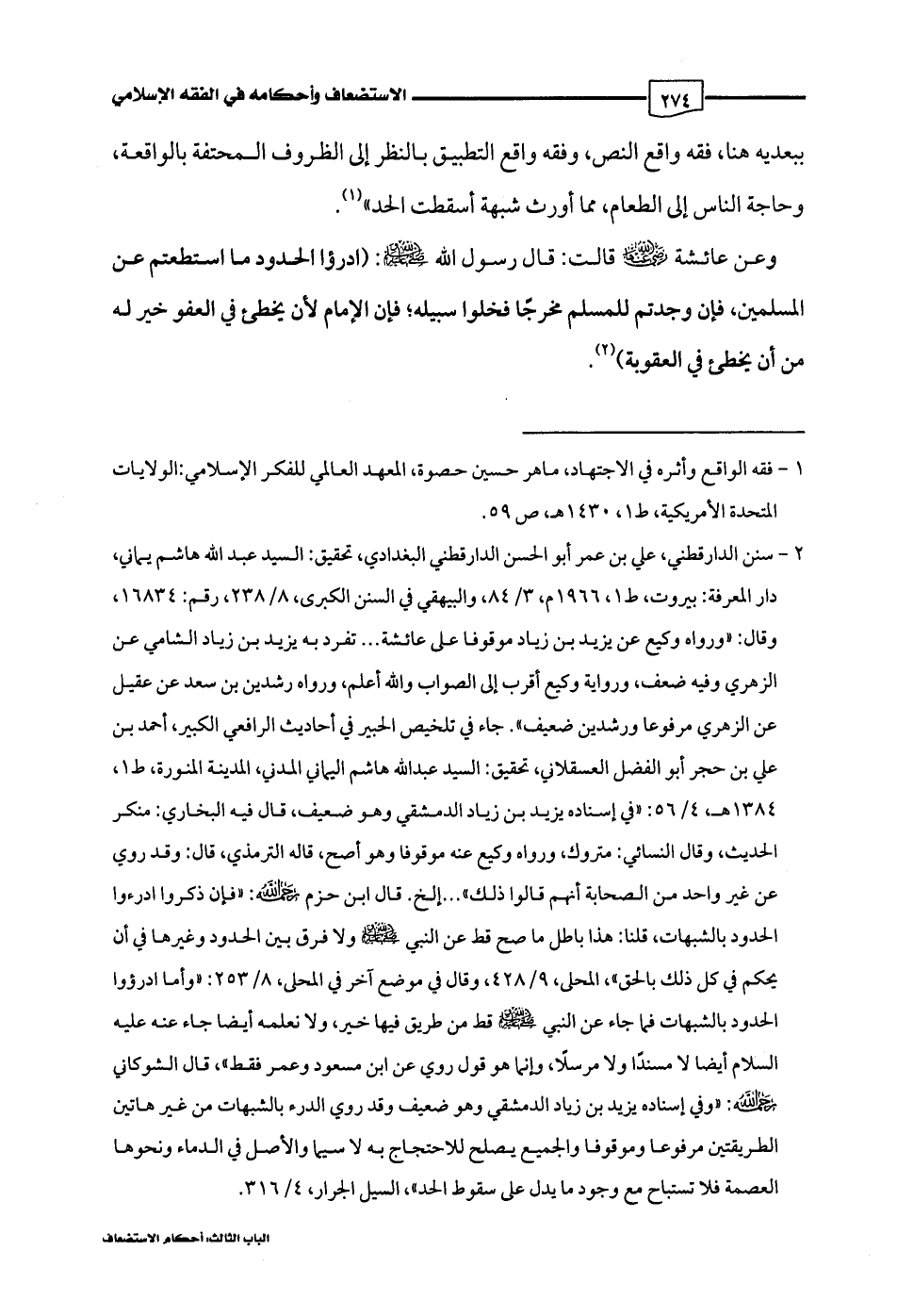 (¬2) سنن الدارقطني، علي بن عمر أبو الحسن الدارقطني البغدادي، تحقيق: السيد عبد اللَّه هاشم يماني، دار المعرفة: بيروت، ط 1، 1966 م، 3/ 84، والبيهقي في السنن الكبرى، 8/ 238، رقم: 16834، وقال: "ورواه وكيع عن يزيد بن زياد موقوفا على عائشة. . . تفرد به يزيد بن زياد الشامي عن الزهري وفيه ضعف، ورواية وكيع أقرب إلى الصواب واللَّه أعلم، ورواه رشدين بن سعد عن عقيل عن الزهري مرفوعا ورشدين ضعيف". جاء في تلخيص الحبير في أحاديث الرافعي الكبير، أحمد بن علي بن حجر أبو الفضل العسقلاني، تحقيق: السيد عبد اللَّه هاشم اليماني المدني، المدينة المنورة، ط 1، 1384 هـ، 4/ 56: "في إسناده يزيد بن زياد الدمشقي وهو ضعيف، قال فيه البخاري: منكر الحديث، وقال النسائي: متروك، ورواه وكيع عنه موقوفا وهو أصح، قاله الترمذي، قال: وقد روي عن غير واحد من الصحابة أنهم قالوا ذلك". . . إلخ. قال ابن حزم رحمه اللَّه: "فإن ذكروا ادرءوا الحدود بالشبهات، قلنا: هذا باطل ما صح قط عن النبي -صلى اللَّه عليه وسلم- ولا فرق بين الحدود وغيرها في أن يحكم في كل ذلك بالحق"، المحل، 9/ 428، وقال في موضع آخر في المحلى، 8/ 253: "وأما ادرؤوا الحدود بالشبهات فما جاء عن النبي -صلى اللَّه عليه وسلم- قط من طريق فيها خير، ولا نعلمه أيضا جاء عنه عليه السلام أيضا لا مسندًا ولا مرسلًا، وإنما هو قول روي عن ابن مسعود وعمر فقط"، قال الشوكاني رحمه اللَّه: "وفي إسناده يزيد بن زياد الدمشقي وهو ضعيف وقد روي الدرء بالشبهات من غير هاتين الطريقتين مرفوعا وموقوفا والجميع يصلح للاحتجاج به لا سيما والأصل في الدماء ونحوها العصمة فلا تستباح مع وجود ما يدل على سقوط الحد"، السيل الجرار، 4/ 316.