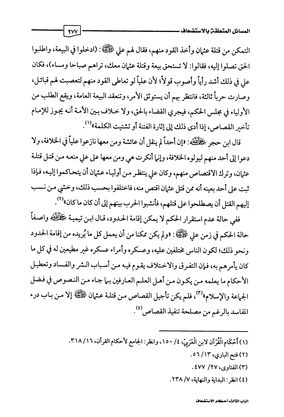 ففي حالة عدم استقرار الحكم لا يمكن إقامة الحدود، قال ابن تيمية رحمه اللَّه واصفًا حالة الحكم في زمن علي -رضي اللَّه عنه-: "ولم يكن ممكنا من أن يعمل كل ما يُريده من إقامة الحدود ونحو ذلك؛ لكون الناس مختلفين عليه، وعسكره وأمراء عسكره غير مطيعين له في كل ما كان يأمرهم به، فإن التفرق والاختلاف يقوم فيه من أسباب الشر والفساد وتعطيل الأحكام ما يعلمه من يكون من أهل العلم العارفين بما جاء من النصوص في فضل الجماعة والإسلام" (¬3)، فلم يكن تأجيل القصاص من قتلة عثمان -رضي اللَّه عنه- إلا من باب درء المفاسد بالرغم من مصلحة تنفيذ القصاص (¬4).
