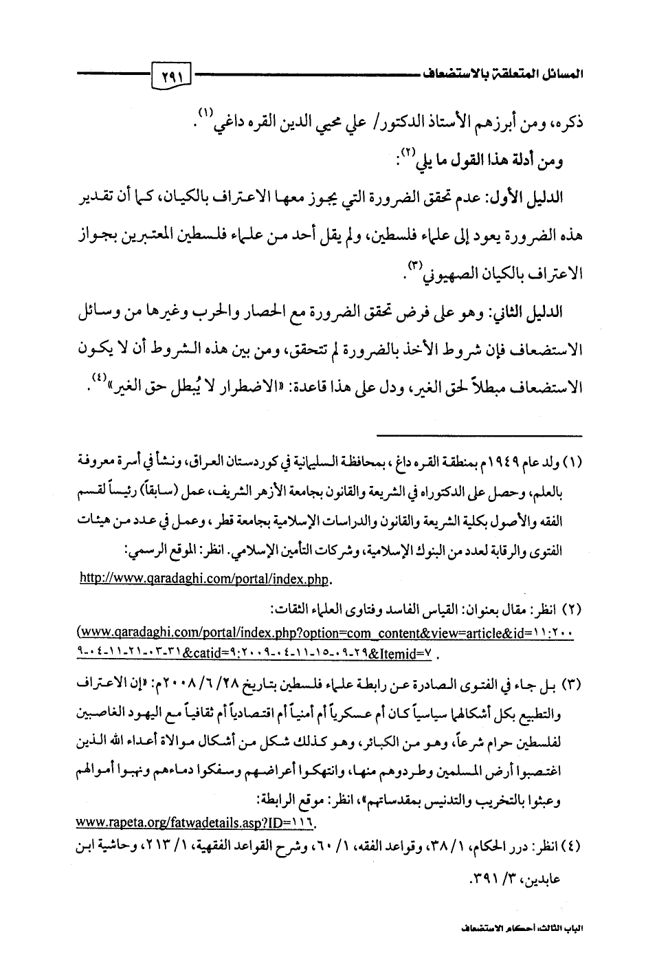 الدليل الأول: عدم تحقق الضرورة التي يجوز معها الاعتراف بالكيان، كما أن تقدير هذه الضرورة يعود إلى علماء فلسطين، ولم يقل أحد من علماء فلسطين المعتبرين بجواز الاعتراف بالكيان الصهيوني (¬3).