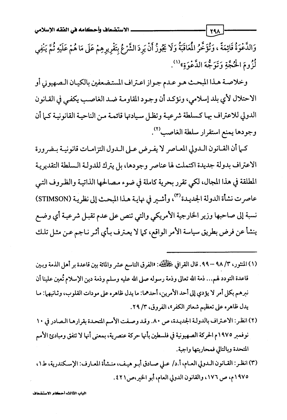 وخلاصة هذا المبحث هو عدم جواز اعتراف المستضعفين بالكيان الصهيوني أو الاحتلال لأي بلد إسلامي، ونؤكد أن وجود المقاومة ضد الغاصب يكفي في القانون الدولي للاعتراف بها كسلطة شرعية وتظل سيادتها قائمة من الناحية القانونية كما أن وجودها يمنع استقرار سلطة الغاصب (¬2).