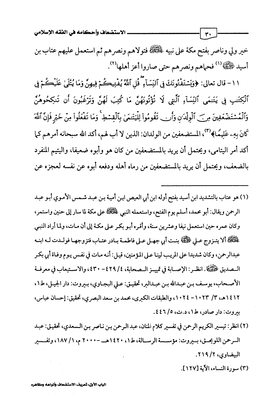 11 - قال تعالى: {وَيَسْتَفْتُونَكَ فِي النِّسَاءِ قُلِ اللَّهُ يُفْتِيكُمْ فِيهِنَّ وَمَا يُتْلَى عَلَيْكُمْ فِي الْكِتَابِ فِي يَتَامَى النِّسَاءِ اللَّاتِي لَا تُؤْتُونَهُنَّ مَا كُتِبَ لَهُنَّ وَتَرْغَبُونَ أَنْ تَنْكِحُوهُنَّ وَالْمُسْتَضْعَفِينَ مِنَ الْوِلْدَانِ وَأَنْ تَقُومُوا لِلْيَتَامَى بِالْقِسْطِ وَمَا تَفْعَلُوا مِنْ خَيْرٍ فَإِنَّ اللَّهَ كَانَ بِهِ عَلِيمًا} (¬3)، المستضعفين من الولدان! الذين لا أب لهم، أكد اللَّه سبحانه أمرهم كما أكد أمر اليتامى، ويحتمل أن يريد بالمستضعفين من كان هو وأبوه ضعيفًا، واليتيم المنفرد بالضعف، ويحتمل أن يريد بالمستضعفين من رماه أهله ودفعه أبوه عن نفسه لعجزه عن