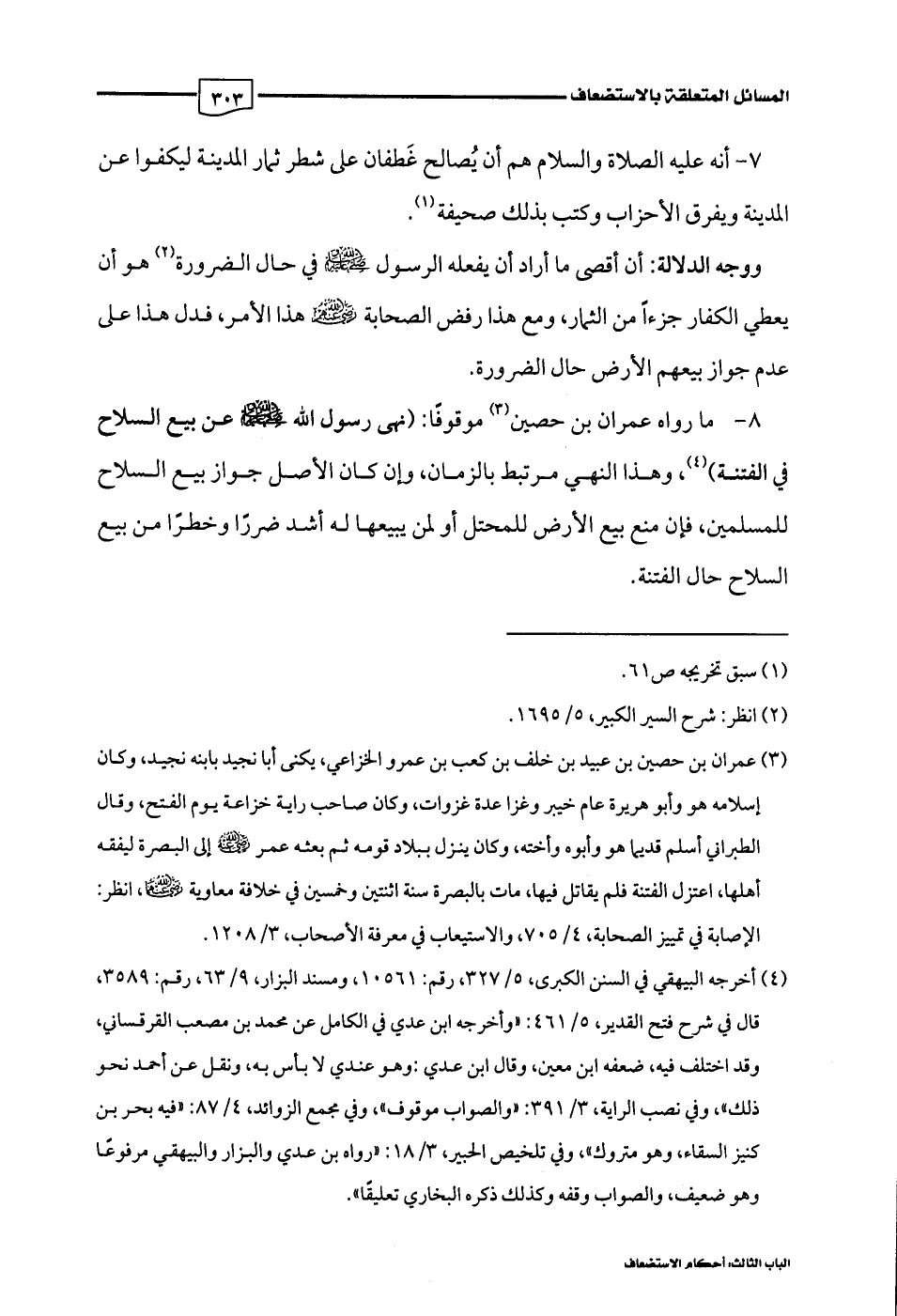 8 - ما رواه عمران بن حصين (¬3) موقوفًا: (نهى رسول اللَّه -صلى اللَّه عليه وسلم- عن بيع السلاح في الفتنة) (¬4)، وهذا النهي مرتبط بالزمان، وإن كان الأصل جواز بيع السلاح للمسلمين، فإن منع بيع الأرض للمحتل أو لمن يبيعها له أشد ضررًا وخطرًا من بيع السلاح حال الفتنة.