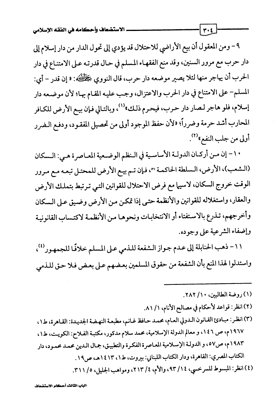 9 - ومن المعقول أن بيع الأراضي للاحتلال قد يؤدي إلى تحول الدار من دار إسلام إلى دار حرب مع مرور السنين، وقد منع الفقهاء المسلم في حال قدرته على الامتناع في دار الحرب أن يهاجر منها لئلا يصير موضعه دار حرب، قال النووي رحمه اللَّه: "إن قدر -أي: المسلم- على الامتناع في دار الحرب والاعتزال، وجب عليه المقام بها؛ لأن موضعه دار إسلام، فلو هاجر لصار دار حرب، فيحرم ذلك" (¬1)، وبالتالي فإن بيع الأرض للكافر المحارب أشد حرمة وضررًا؛ "لأن حفظ الموجود أولى من تحصيل المفقود، ودفع الضرر أولى من جلب النفع" (¬2).