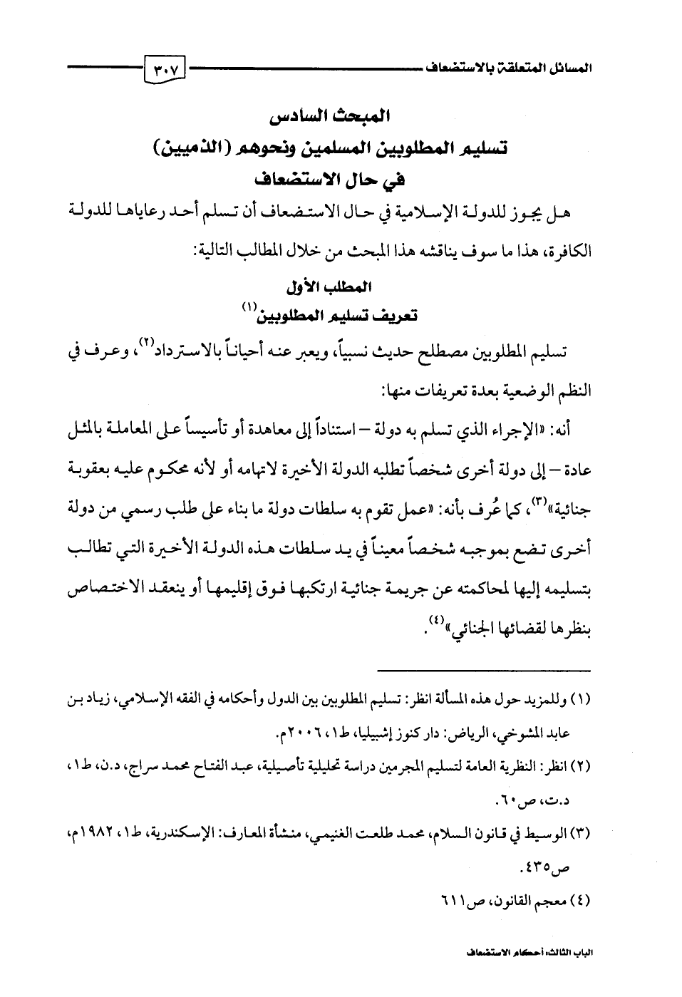 (¬1) وللمزيد حول هذه المسألة انظر: تسليم المطلوبين بين الدول وأحكامه في الفقه الإسلامي، زياد بن عابد المشوخي، الرياض: دار كنوز إشبيليا، ط 1، 2006 م.