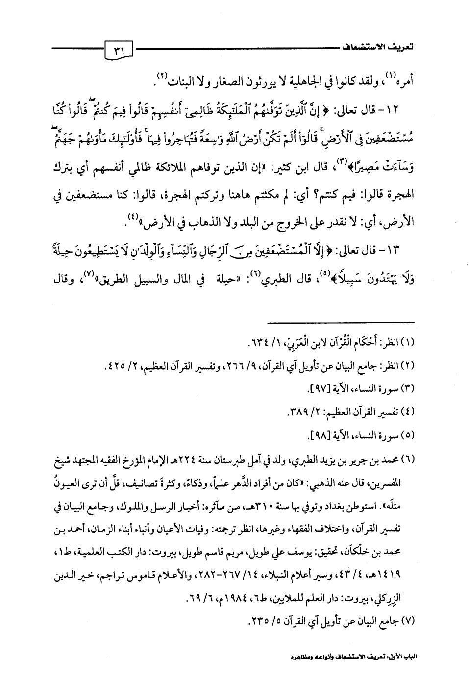 12 - قال تعالى: {إِنَّ الَّذِينَ تَوَفَّاهُمُ الْمَلَائِكَةُ ظَالِمِي أَنْفُسِهِمْ قَالُوا فِيمَ كُنْتُمْ قَالُوا كُنَّا مُسْتَضْعَفِينَ فِي الْأَرْضِ قَالُوا أَلَمْ تَكُنْ أَرْضُ اللَّهِ وَاسِعَةً فَتُهَاجِرُوا فِيهَا فَأُولَئِكَ مَأْوَاهُمْ جَهَنَّمُ وَسَاءَتْ مَصِيرًا} (¬3)، قال ابن كثير: "إن الذين توفاهم الملائكة ظالمي أنفسهم أي بترك الهجرة قالوا: فيم كنتم؟ أي: لم مكثتم هاهنا وتركتم الهجرة، قالوا: كنا مستضعفين في الأرض، أي: لا نقدر على الخروج من البلد ولا الذهاب في الأرض" (¬4).