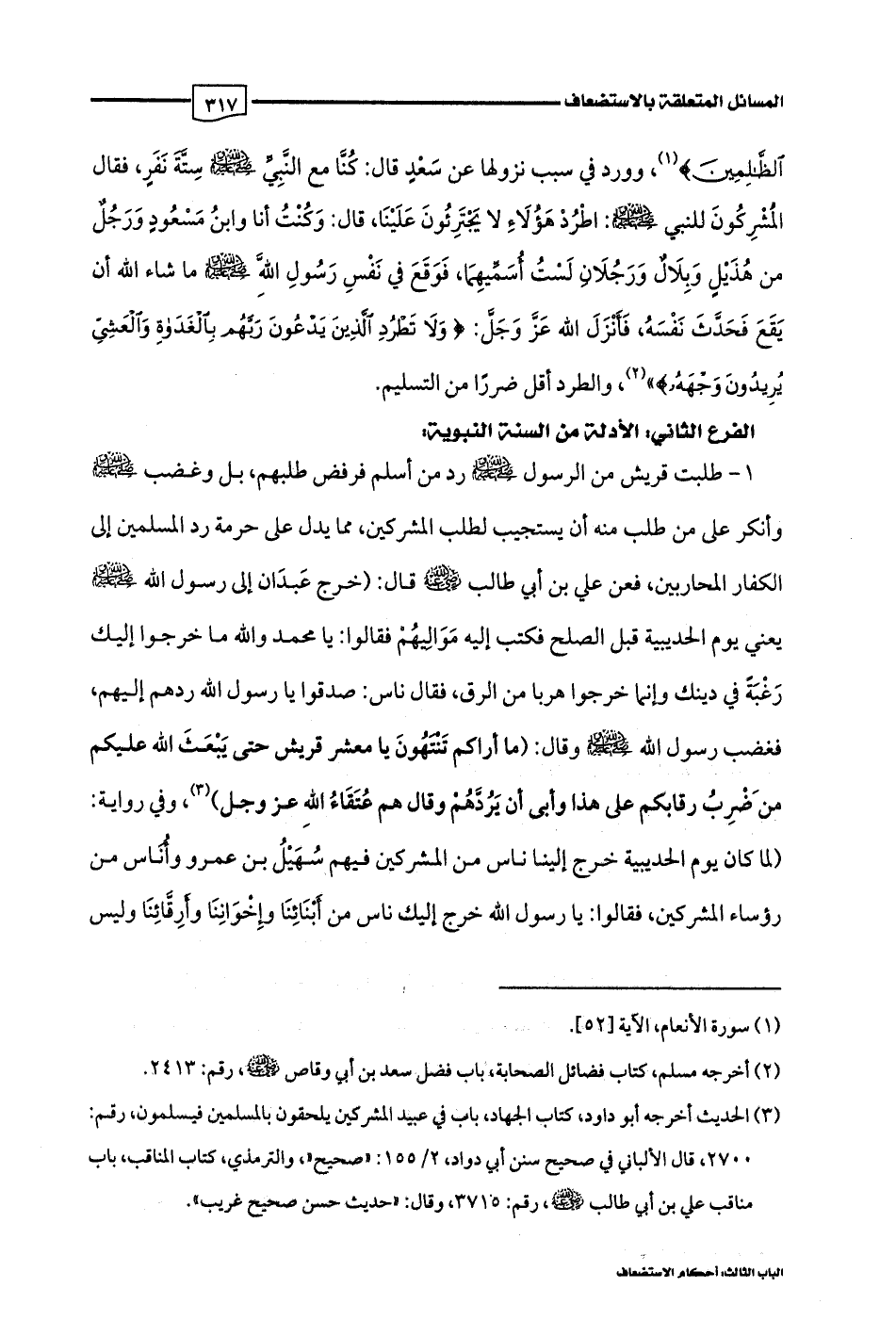 (¬3) الحديث أخرجه أبو داود، كتاب الجهاد، باب في عبيد المشركين يلحقون بالمسلمين فيسلمون، رقم: 2700، قال الألباني في صحيح سنن أبي دواد، 2/ 155: "صحيح"، والترمذي، كتاب المناقب، باب مناقب علي بن أبي طالب -رضي اللَّه عنه-، رقم: 3715، وقال: "حديث حسن صحيح غريب".