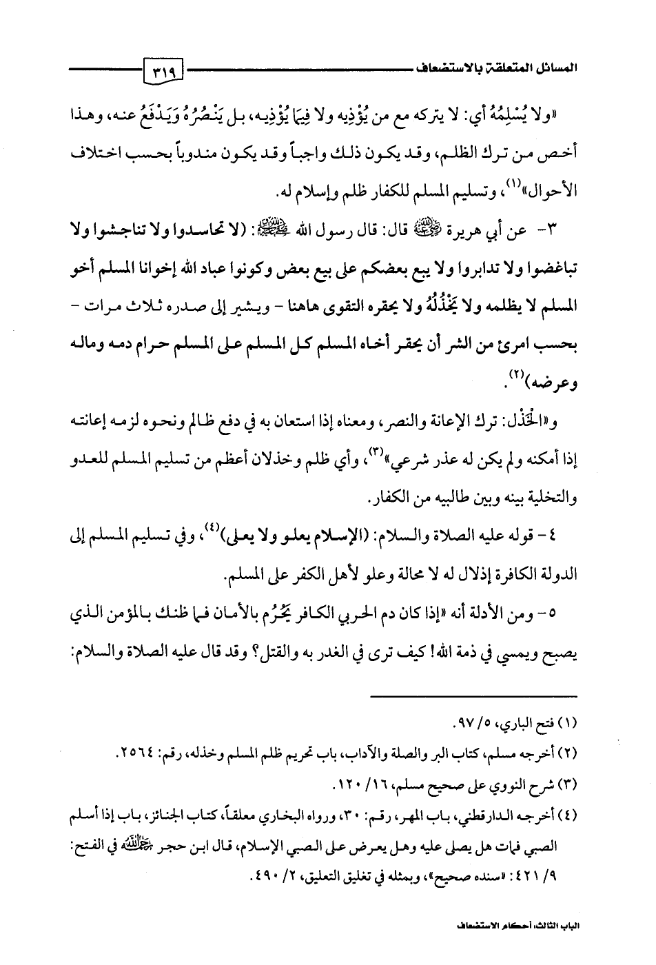 4 - قوله عليه الصلاة والسلام: (الإسلام يعلو ولا يعلى) (¬4)، وفي تسليم المسلم إلى الدولة الكافرة إذلال له لا محالة وعلو لأهل الكفر على المسلم.
