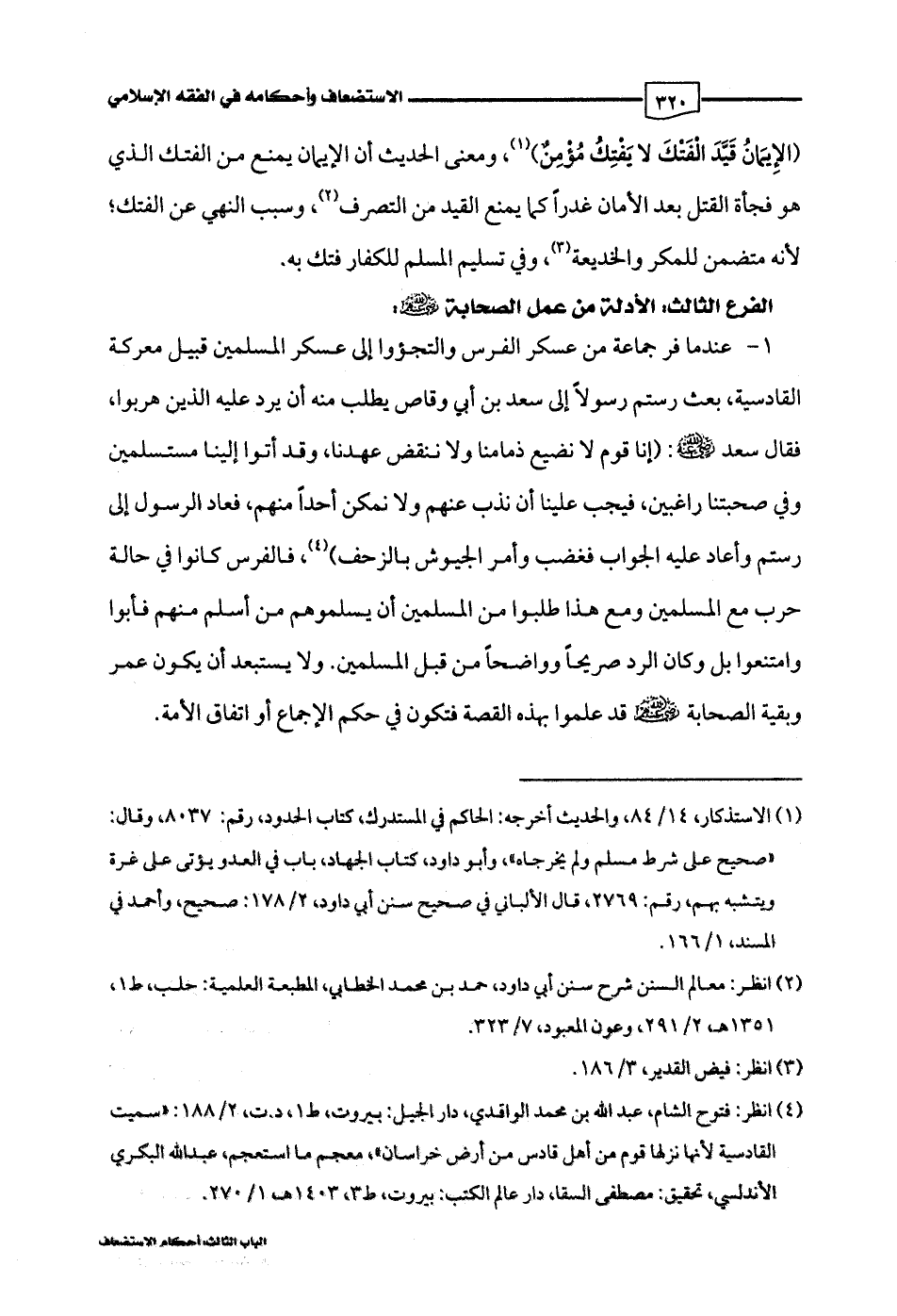 1 - عندما فر جماعة من عسكر الفرس والتجؤوا إلى عسكر المسلمين قبيل معركة القادسية، بعث رستم رسولًا إلى سعد بن أبي وقاص يطلب منه أن يرد عليه الذين هربوا، فقال سعد -رضي اللَّه عنه-: (إنا قوم لا نضيع ذمامنا ولا ننقض عهدنا، وقد أتوا إلينا مستسلمين وفي صحبتنا راغبين، فيجب علينا أن نذب عنهم ولا نمكن أحدًا منهم، فعاد الرسول إلى رستم وأعاد عليه الجواب فغضب وأمر الجيوش بالزحف) (¬4)، فالفرس كانوا في حالة حرب مع المسلمين ومع هذا طلبوا من المسلمين أن يسلموهم من أسلم منهم فأبوا وامتنعوا بل وكان الرد صريحًا وواضحًا من قبل المسلمين. ولا يستبعد أن يكون عمر وبقية الصحابة -رضي اللَّه عنهم- قد علموا بهذه القصة فتكون في حكم الإجماع أو اتفاق الأمة.