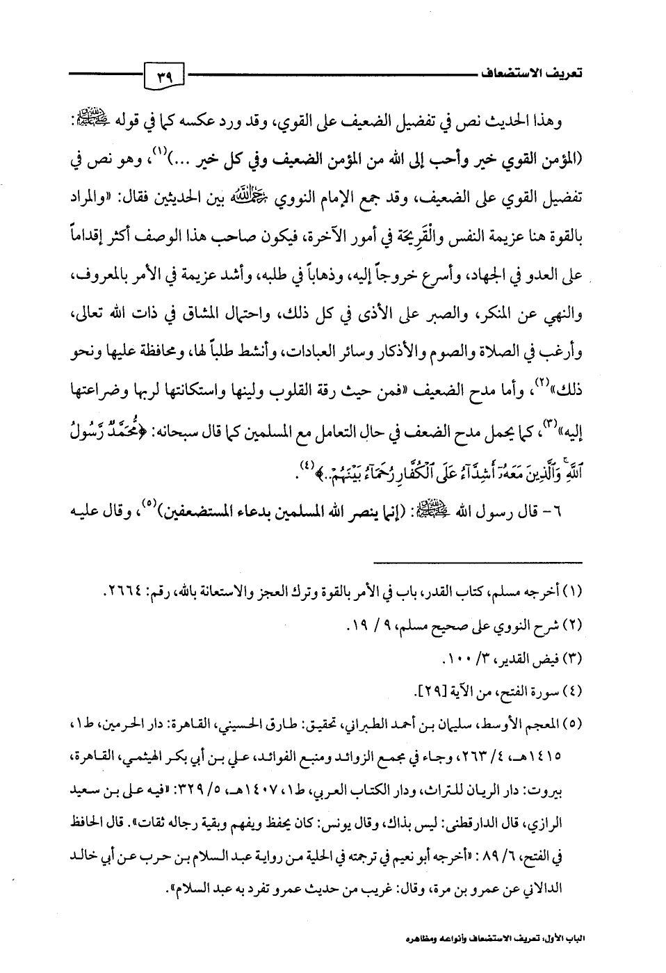 وهذا الحديث نص في تفضيل الضعيف على القوي، وقد ورد عكسه كما في قوله -صلى اللَّه عليه وسلم-: (المؤمن القوي خير وأحب إلى اللَّه من المؤمن الضعيف وفي كل خير. . .) (¬1)، وهو نص في تفضيل القوي على الضعيف، وقد جمع الإِمام النووي رحمه اللَّه بين الحديثين فقال: "والمراد بالقوة هنا عزيمة النفس والْقَرِيحَة في أمور الآخرة، فيكون صاحب هذا الوصف أكثر إقدامًا على العدو في الجهاد، وأسرع خروجًا إليه، وذهابًا في طلبه، وأشد عزيمة في الأمر بالمعروف، والنهي عن المنكر، والصبر على الأذى في كل ذلك، واحتمال المشاق في ذات اللَّه تعالى، وأرغب في الصلاة والصوم والأذكار وسائر العبادات، وأنشط طلبًا لها، ومحافظة عليها ونحو ذلك" (¬2)، وأما مدح الضعيف "فمن حيث رقة القلوب ولينها واستكانتها لربها وضراعتها إليه" (¬3)، كما يحمل مدح الضعف في حال التعامل مع المسلمين كما قال سبحانه: {مُحَمَّدٌ رَسُولُ اللَّهِ وَالَّذِينَ مَعَهُ أَشِدَّاءُ عَلَى الْكُفَّارِ رُحَمَاءُ بَيْنَهُمْ. . .} (¬4).