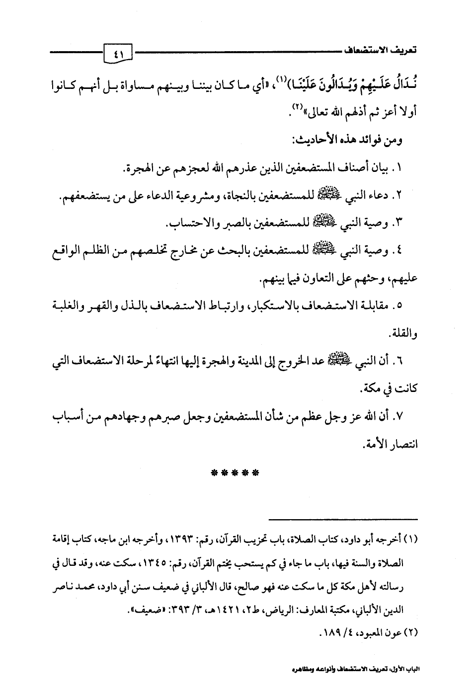 6. أن النبي -صلى اللَّه عليه وسلم- عد الخروج إلى المدينة والهجرة إليها انتهاءً لمرحلة الاستضعاف التي كانت في مكة.