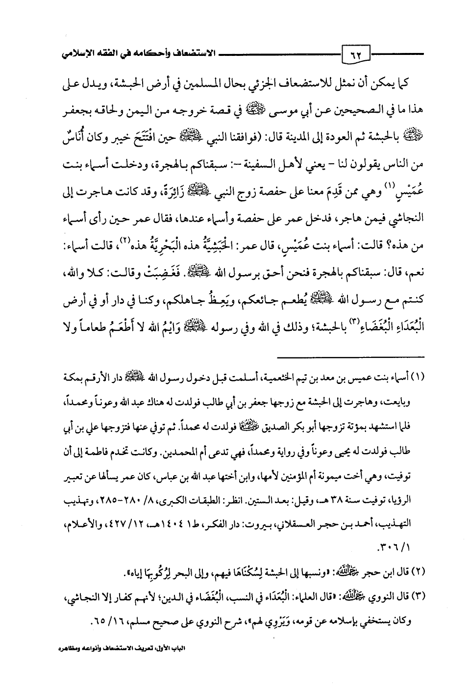 كما يمكن أن نمثل للاستضعاف الجزئي بحال المسلمين في أرض الحبشة، ويدل على هذا ما في الصحيحين عن أبي موسى -رضي اللَّه عنه- في قصة خروجه من اليمن ولحاقه بجعفر -رضي اللَّه عنه- بالحبشة ثم العودة إلى المدينة قال: (فوافقنا النبي -صلى اللَّه عليه وسلم- حين افْتَتَحَ خيبر وكان أُنَاسٌ من الناس يقولون لنا -يعني لأهل السفينة-: سبقناكم بالهجرة، ودخلت أسماء بنت عُمَيْسِ (¬1) وهي ممن قَدِمَ معنا على حفصة زوج النبي -صلى اللَّه عليه وسلم- زَائِرَةً، وقد كانت هاجرت إلى النجاشي فيمن هاجر، فدخل عمر على حفصة وأسماء عندها، فقال عمر حين رأى أسماء من هذه؟ قالت: أسماء بنت عُمَيْسٍ، قال عمر: الْحَبَشِيَّةُ هذه الْبَحْرِيَّةُ هذه (¬2)، قالت أسماء: نعم، قال: سبقناكم بالهجرة فنحن أحق برسول اللَّه -صلى اللَّه عليه وسلم-. فَغَضِبَتْ وقالت: كلا واللَّه، كنتم مع رسول اللَّه -صلى اللَّه عليه وسلم- يُطعم جائعكم، ويَعِظُ جاهلكم، وكنا في دار أو في أرض الْبُعَدَاءِ الْبُغَضَاءِ (¬3) بالحبشة؛ وذلك في اللَّه وفي رسوله -صلى اللَّه عليه وسلم- وَايْمُ اللَّه لا أَطْعَمُ طعامًا ولا