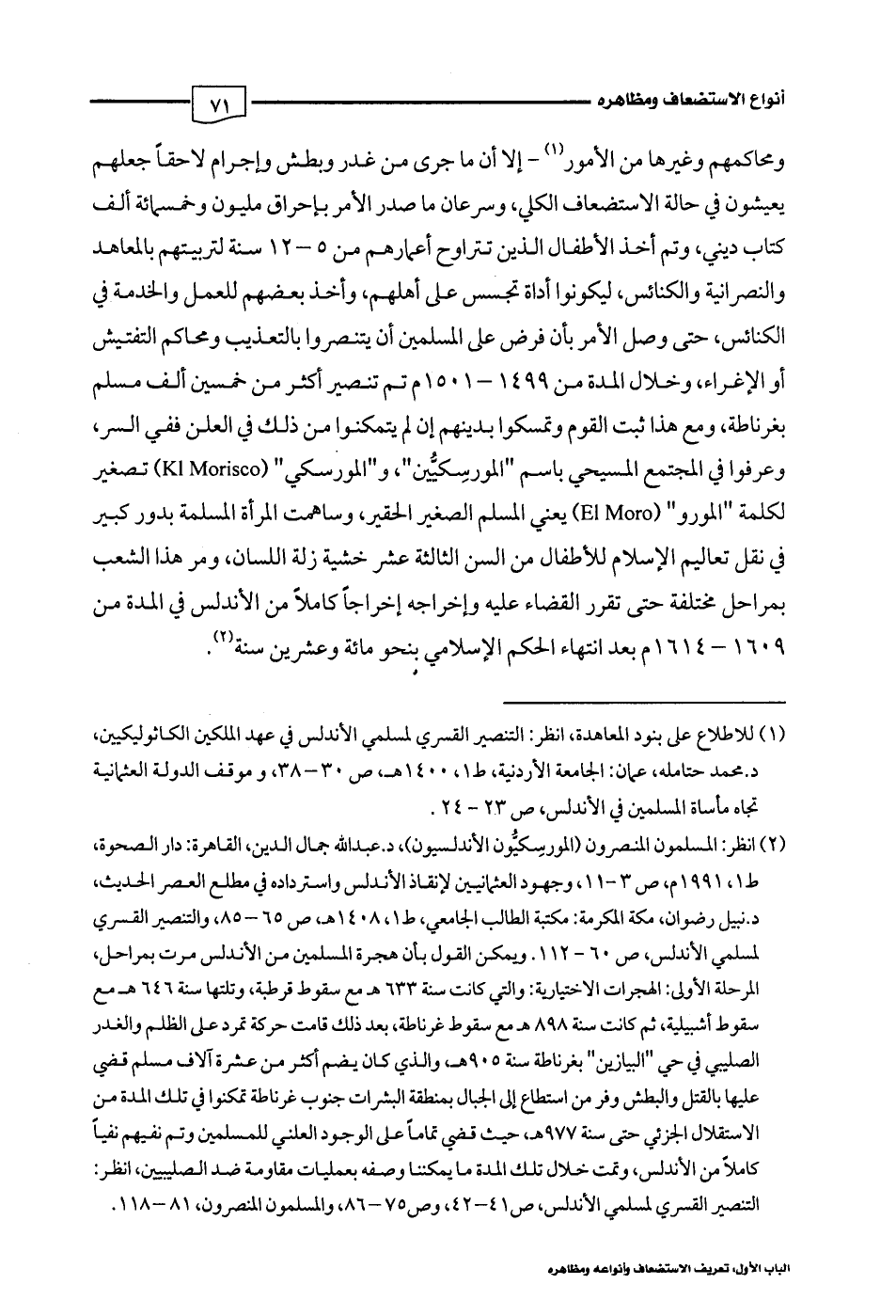 (¬2) انظر: المسلمون المنصرون (المورسِكيُّون الأندلسيون)، د. عبد اللَّه جمال الدين، القاهرة: دار الصحوة، ط 1، 1991 م، ص 3 - 11، وجهود العثمانيين لإنقاذ الأندلس واسترداده في مطلع العمر الحديث، د. نبيل رضوان، مكة المكرمة: مكتبة الطالب الجامعي، ط 1، 1408 هـ، ص 65 - 85، والتنصير القسري لمسلمي الأندلس، ص 60 - 112. ويمكن القول بأن هجرة المسلمين من الأندلس مرت بمراحل، المرحلة الأولى: الهجرات الاختيارية: والتي كانت سنة 633 هـ مع سقوط قرطبة، وتلتها سنة 646 هـ مع سقوط أشبيلية، ثم كانت سنة 898 هـ مع سقوط غرناطة، بعد ذلك قامت حركة تمرد على الظلم والغدر الصليبي في حي "البيازين" بغرناطة سنة 905 هـ، والذي كان يضم أكثر من عشرة آلاف مسلم قضي عليها بالقتل والبطش وفر من استطاع إلى الجبال بمنطقة البشرات جنوب غرناطة تمكنوا في تلك المدة من الاستقلال الجزئي حتى سنة 977 هـ، حيث قضي تمامًا على الوجود العلني للمسلمين وتم نفيهم نفيًا كاملًا من الأندلس، وتمت خلال تلك المدة ما يمكننا وصفه بعمليات مقاومة ضد الصليبيين، انظر: التنصير القسري لمسلمي الأندلس، ص 41 - 42، وص 75 - 86، والمسلمون المنصرون، 81 - 118.