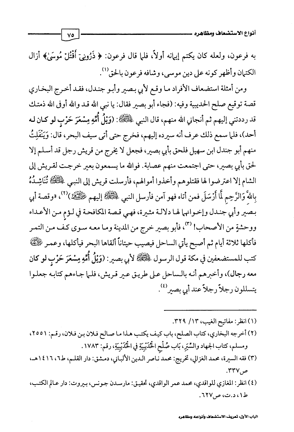 ومن أمثلة استضعاف الأفراد ما وقع لأبي بصير وأبو جندل، فقد أخرج البخاري قصة توقيع صلح الحديبية وفيه: (فجاء أبو بصير فقال: يا نبي اللَّه قد واللَّه أوفى اللَّه ذمتك قد رددتني إليهم ثم أنجاني اللَّه منهم، قال النبي -صلى اللَّه عليه وسلم-: (وَيْلُ أُمِّهِ مِسْعَرَ حَرْبٍ لو كان له أحد)، فلما سمع ذلك عرف أنه سيرده إليهم، فخرج حتى أتى سيف البحر، قال: وَيَنْفَلِتُ منهم أبو جندل ابن سهيل فلحق بأبي بصير، فجعل لا يخرج من قريش رجل قد أسلم إلا لحق بأبي بصير، حتى اجتمعت منهم عصابة. فواللَّه ما يسمعون بعير خرجت لقريش إلى الشام إلا اعترضوا لها فقتلوهم وأخذوا أموالهم، فأرسلت قريش إلى النبي -صلى اللَّه عليه وسلم- تُنَاشِدُهُ بِاللَّه وَالرَّحِمِ لمَّا أَرْسَلَ فمن أتاه فهو آمن فأرسل النبي -صلى اللَّه عليه وسلم- إليهم -رضي اللَّه عنهم-) (¬2)، "وقصة أبي بصير وأبي جندل وإخوانها لها دلالة مثيرة، فهي قصة المكافحة في لؤمٍ من الأعداء ووحشةٍ من الأصحاب! (¬3)، فأبو بصير خرج من المدينة وما معه سوى كف من التمر فأكلها ثلاثة أيام ثم أصبح يأتي الساحل فيصيب حيتانًا ألقاها البحر فيأكلها، وعمر -رضي اللَّه عنه- كتب للمستضعفين في مكة قول الرسول -صلى اللَّه عليه وسلم- لأبي بصير: (وَيْلُ أُمِّهِ مِسْعَرَ حَرْبٍ لو كان معه رجال)، وأخبرهم أنه بالساحل على طريق عير قريش، فلما جاءهم كتابه جعلوا يتسللون رجلًا رجلًا عند أبي بصير (¬4).