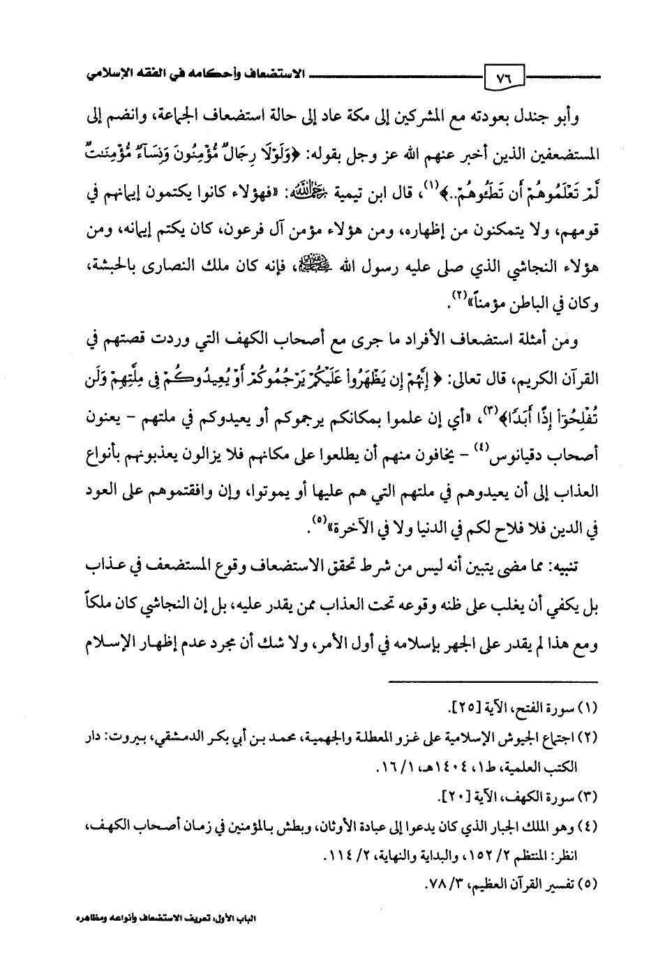 تنبيه: مما مضى يتبين أنه ليس من شرط تحقق الاستضعاف وقوع المستضعف في عذاب بل يكفي أن يغلب على ظنه وقوعه تحت العذاب ممن يقدر عليه، بل إن النجاشي كان ملكًا ومع هذا لم يقدر على الجهر بإسلامه في أول الأمر، ولا شك أن مجرد عدم إظهار الإسلام