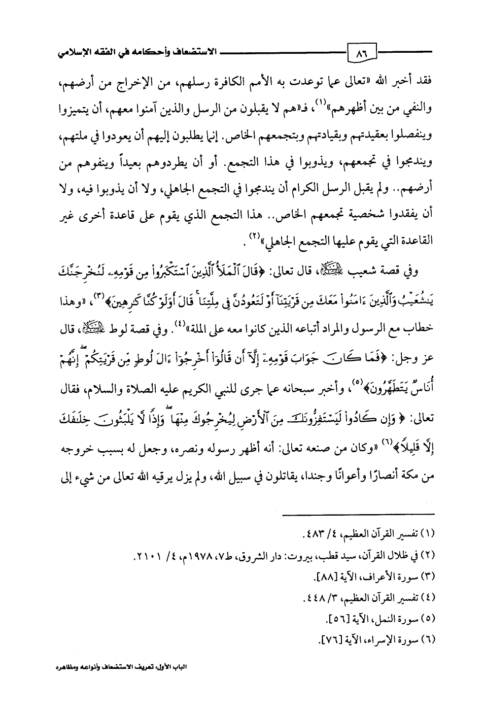 وفي قصة شعيب عليه السلام، قال تعالى: {قَالَ الْمَلَأُ الَّذِينَ اسْتَكْبَرُوا مِنْ قَوْمِهِ لَنُخْرِجَنَّكَ يَاشُعَيْبُ وَالَّذِينَ آمَنُوا مَعَكَ مِنْ قَرْيَتِنَا أَوْ لَتَعُودُنَّ فِي مِلَّتِنَا قَالَ أَوَلَوْ كُنَّا كَارِهِينَ} (¬3)، "وهذا خطاب مع الرسول والمراد أتباعه الذين كانوا معه على الملة" (¬4). وفي قصة لوط عليه السلام، قال عز وجل: {فَمَا كَانَ جَوَابَ قَوْمِهِ إِلَّا أَنْ قَالُوا أَخْرِجُوا آلَ لُوطٍ مِنْ قَرْيَتِكُمْ إِنَّهُمْ أُنَاسٌ يَتَطَهَّرُونَ} (¬5)، وأخبر سبحانه عما جرى للنبي الكريم عليه الصلاة والسلام، فقال تعالى: {وَإِنْ كَادُوا لَيَسْتَفِزُّونَكَ مِنَ الْأَرْضِ لِيُخْرِجُوكَ مِنْهَا وَإِذًا لَا يَلْبَثُونَ خِلَافَكَ إِلَّا قَلِيلًا} (¬6) "وكان من صنعه تعالى: أنه أظهر رسوله ونصره، وجعل له بسبب خروجه من مكة أنصارًا وأعوانًا وجندا، يقاتلون في سبيل اللَّه، ولم يزل يرقيه اللَّه تعالى من شيء إلى