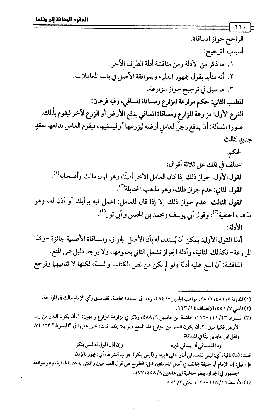 (¬1) المدونة 5/ 486، 6/ 28، مواهب الجليل 7/ 484، وهذا في المساقاة خاصة، فقد سبق رأي الإمام مالك في المزارعة.