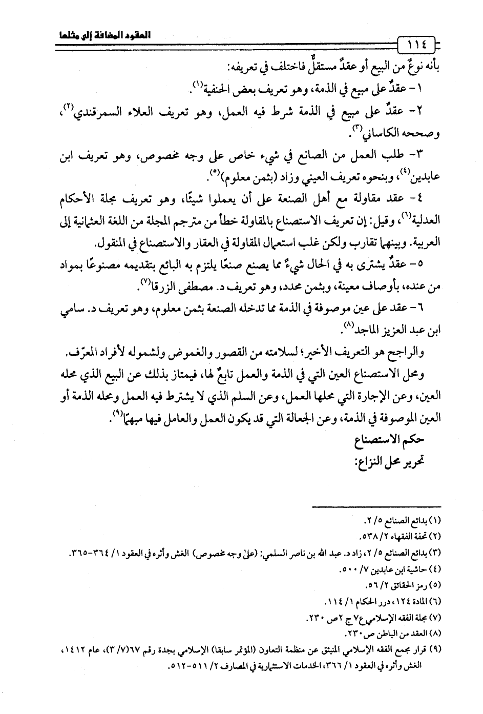 5 - عقدٌ يشترى به في الحال شيءٌ مما يصنع صنعًا يلتزم به البائع بتقديمه مصنوعًا بمواد من عنده، بأوصاف معينة، وبثمن محدد، وهو تعريف د. مصطفى الزرقا (¬7).